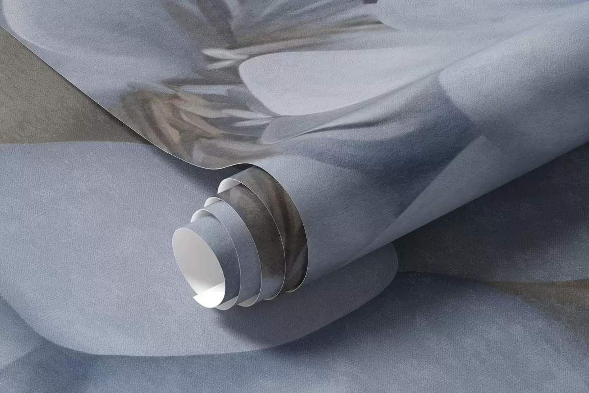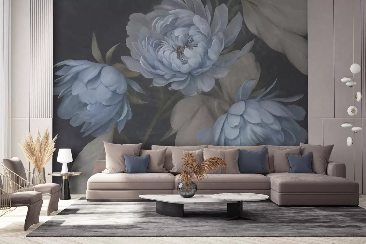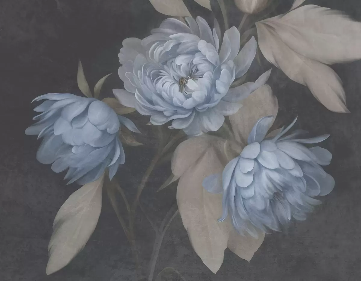 Fotobehang Lichtblauwe pioenrozen met structuur en beige bladeren tegen een donkere achtergrond N° w09751