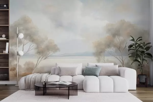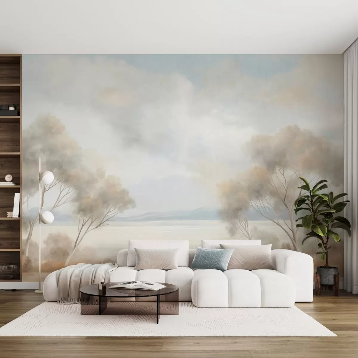 Fotobehang Een landschapsschilderij met textuur, met bomen onder een bewolkte hemel N° w09753