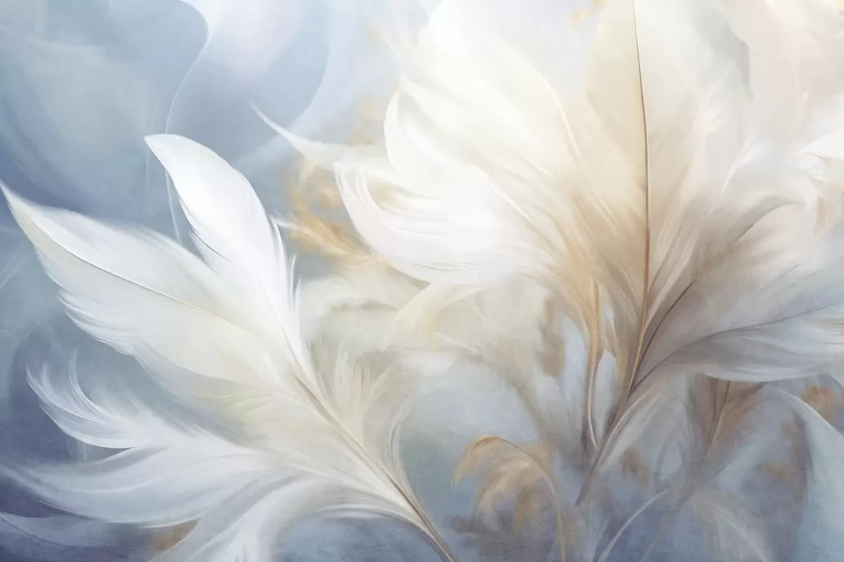 Fotobehang Zachte, witte veren met textuur en wazig pampagras met blauwe en witte achtergrond N° w09758