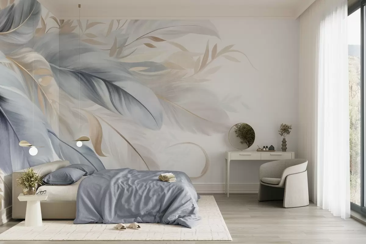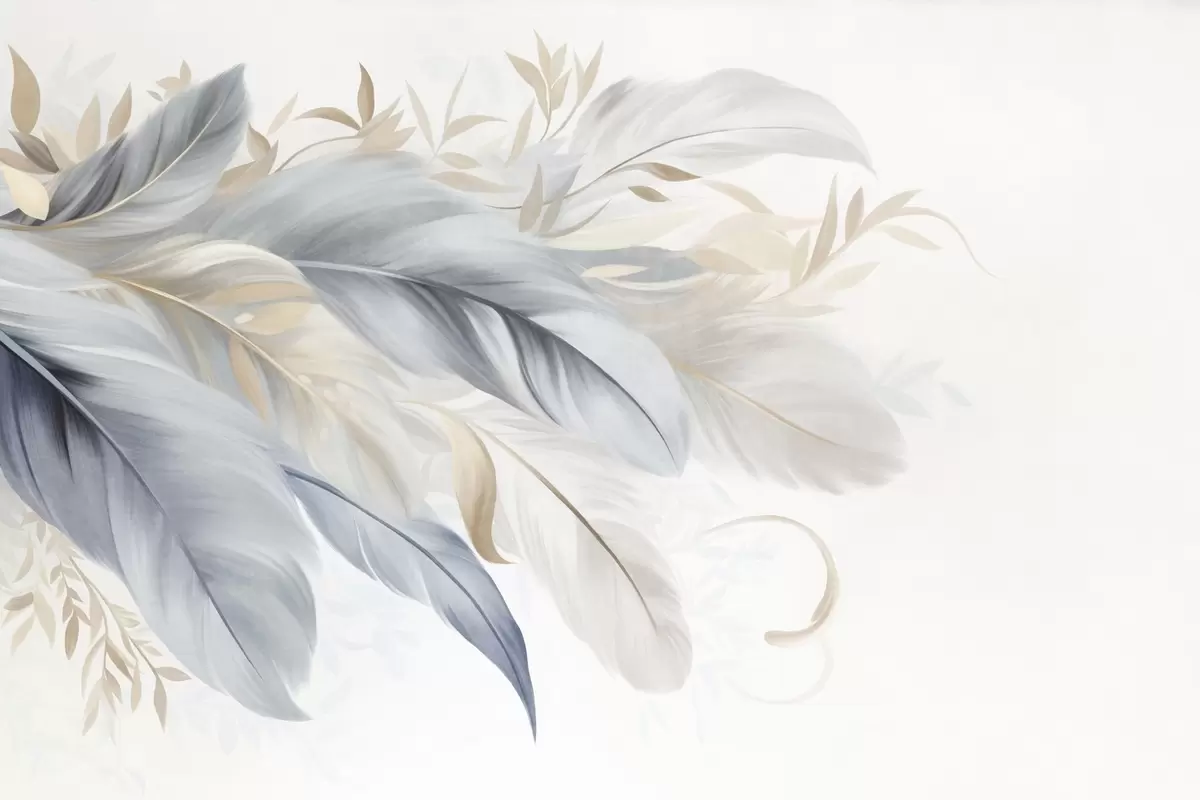 Fotobehang Getextureerde pastelkleurige veren en delicate blaadjes tegen een lichte achtergrond N° w09763