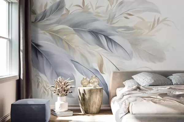 Fotobehang Getextureerde pastelkleurige veren en delicate blaadjes tegen een lichte achtergrond N° w09763