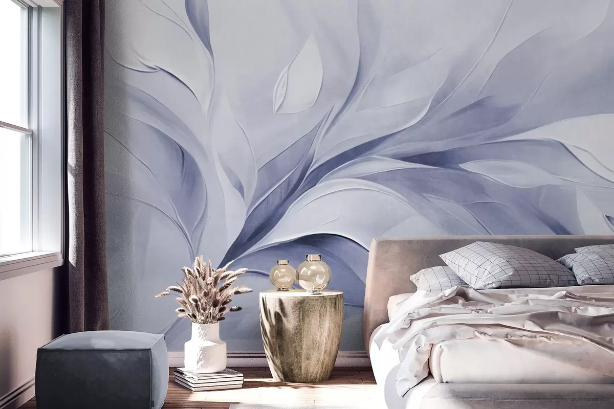 Fotobehang Abstracte schilderstijl met textuur van lichtblauwe en witte vloeiende bladeren N° w09765