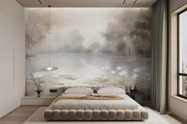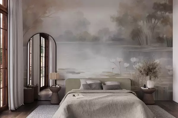 Fotobehang Een landschap met reliëf, een meer met witte waterlelies, omringd door bomen in gedempte kleuren N° w09768