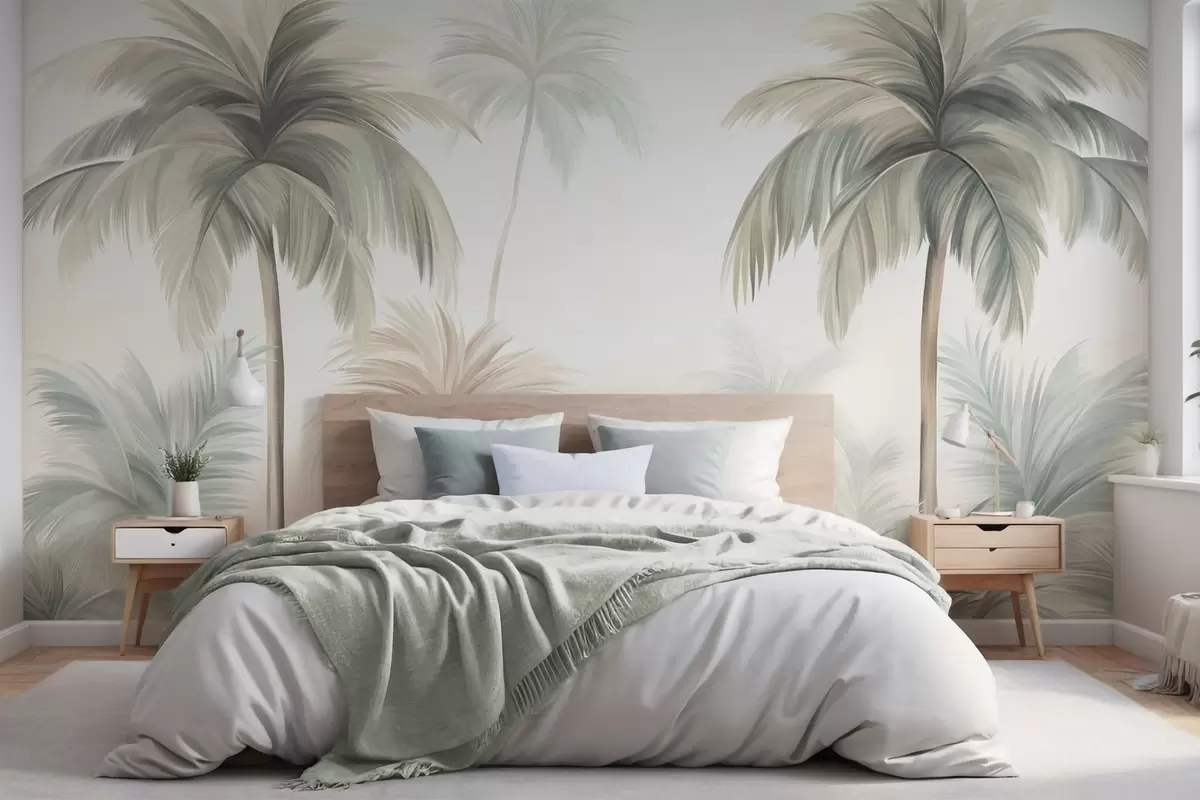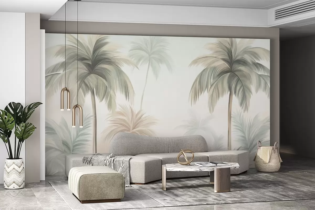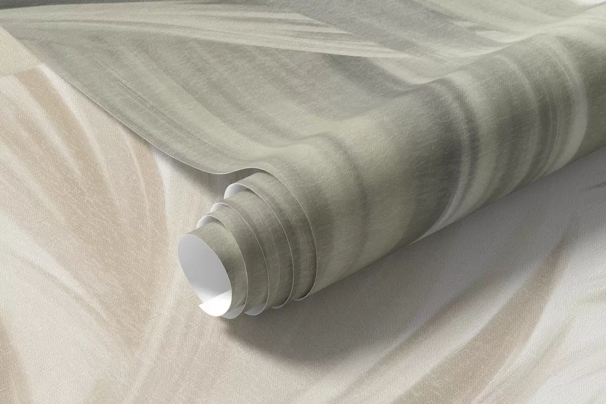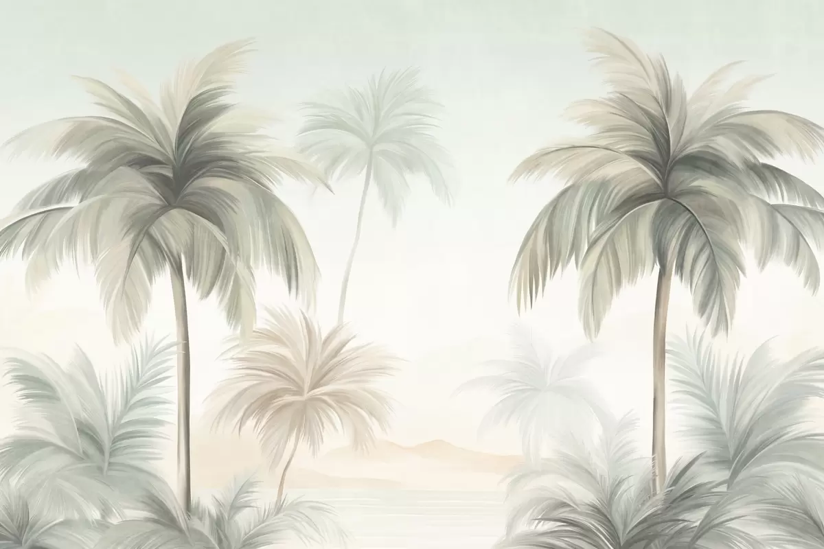 Fotobehang Palmbomen met een gestructureerd blad, waarvan de bladeren in gedempte groene en beige tinten tegen een zachte lucht afsteken N° w09770