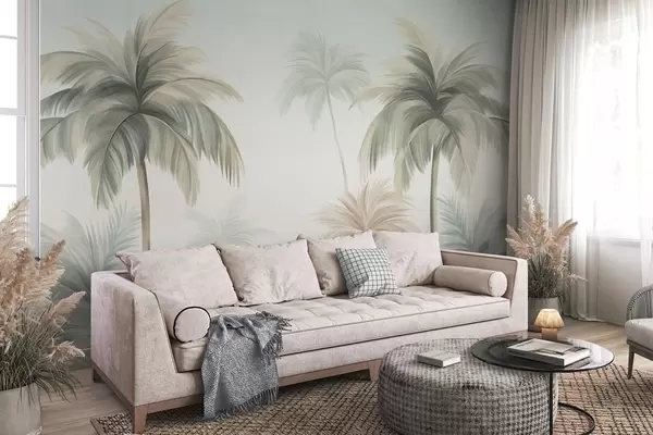 Fotobehang Palmbomen met een gestructureerd blad, waarvan de bladeren in gedempte groene en beige tinten tegen een zachte lucht afsteken N° w09770