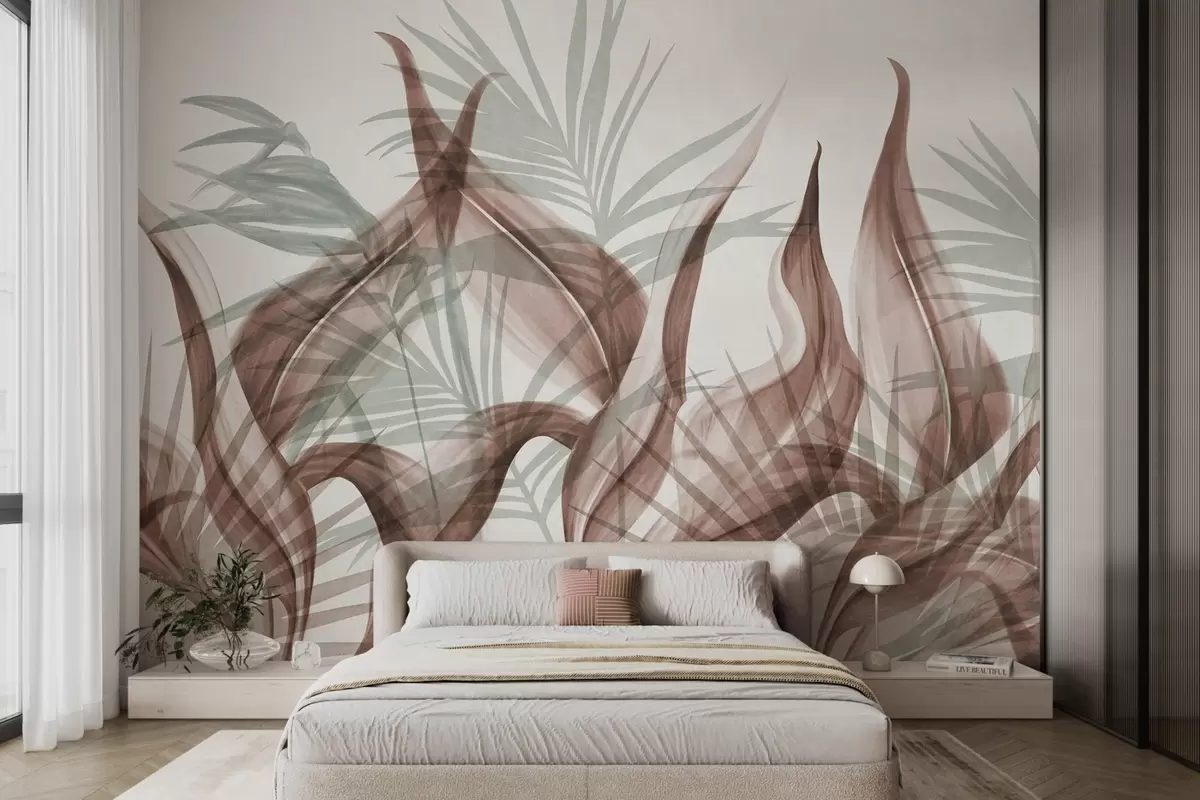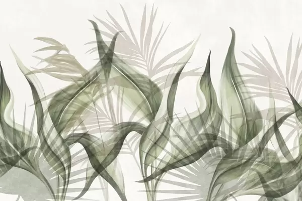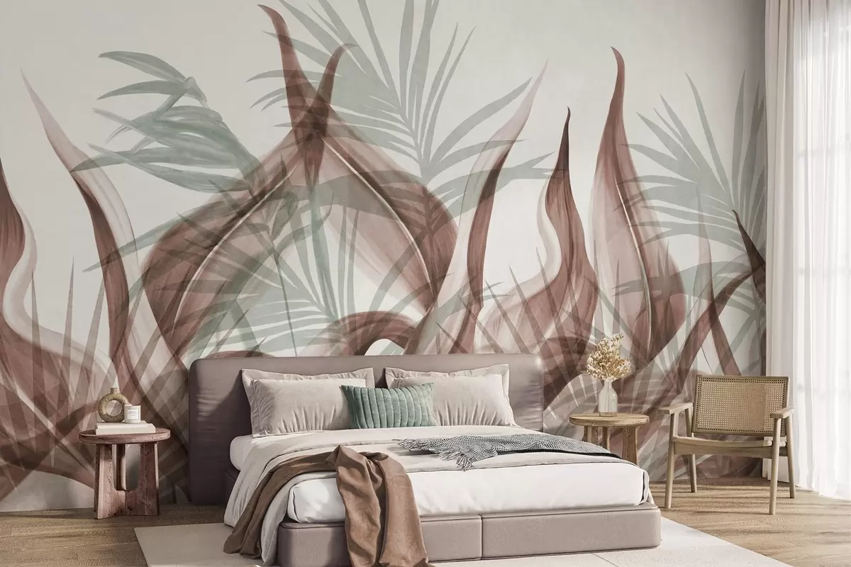 Fotobehang Tropische bladeren in bruine en groene tinten tegen een witte achtergrond, gestructureerde aquarelstijl N° w09772