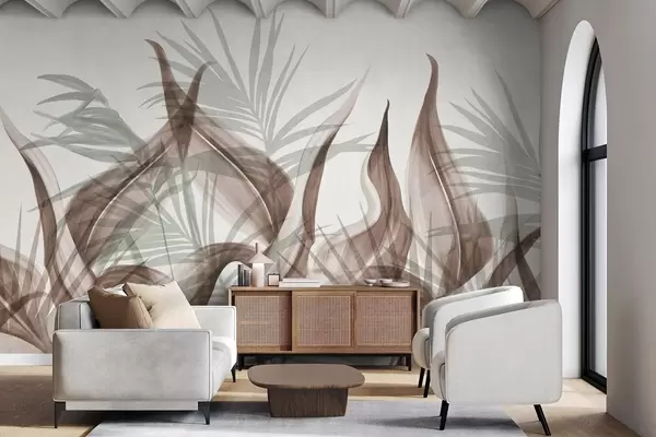 Fotobehang Tropische bladeren in bruine en groene tinten tegen een witte achtergrond, gestructureerde aquarelstijl N° w09772