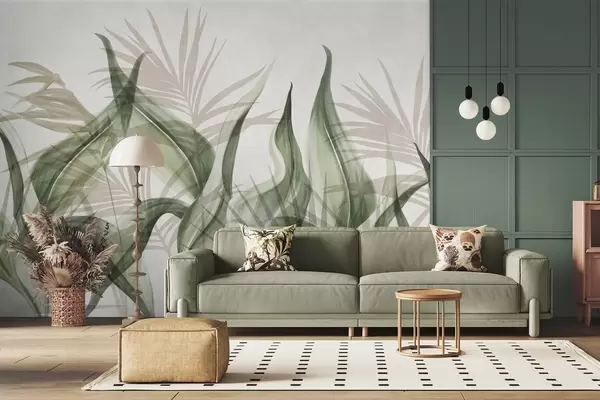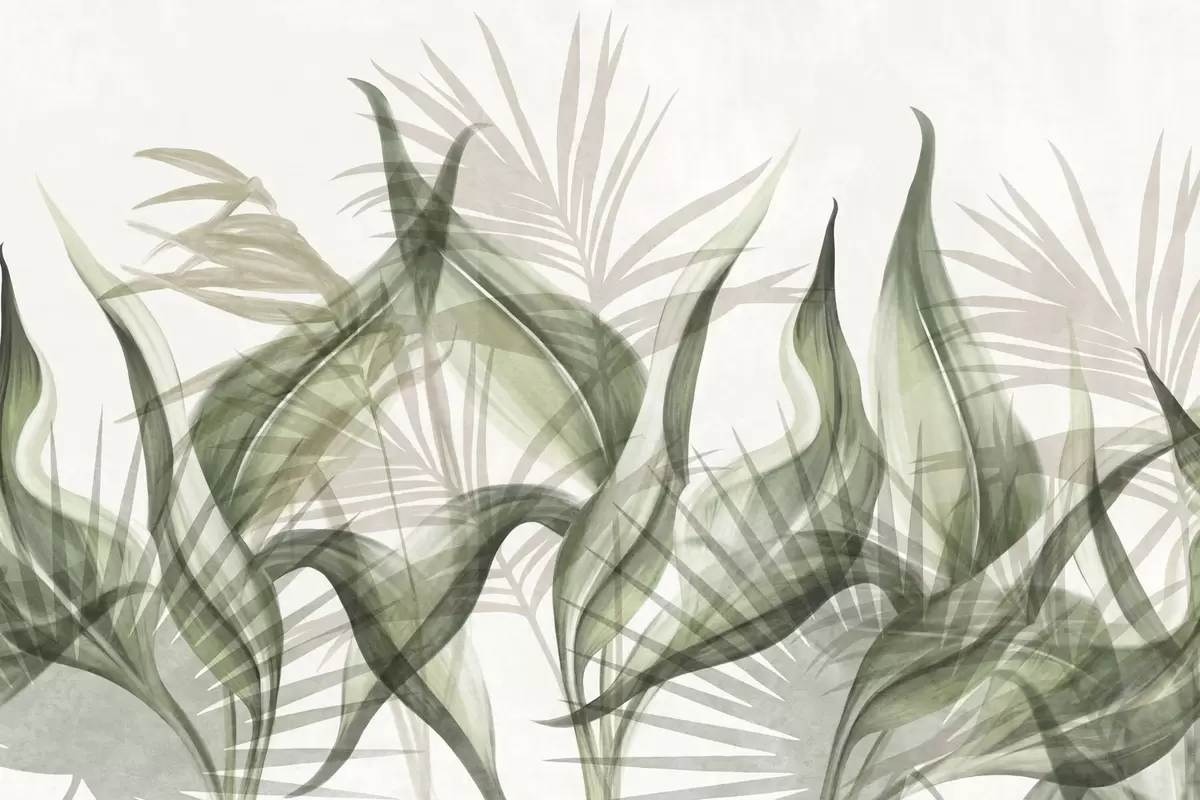 Fotobehang Tropische bladeren in beige en groene tinten tegen een witte achtergrond, gestructureerde aquarelstijl N° w09772v1