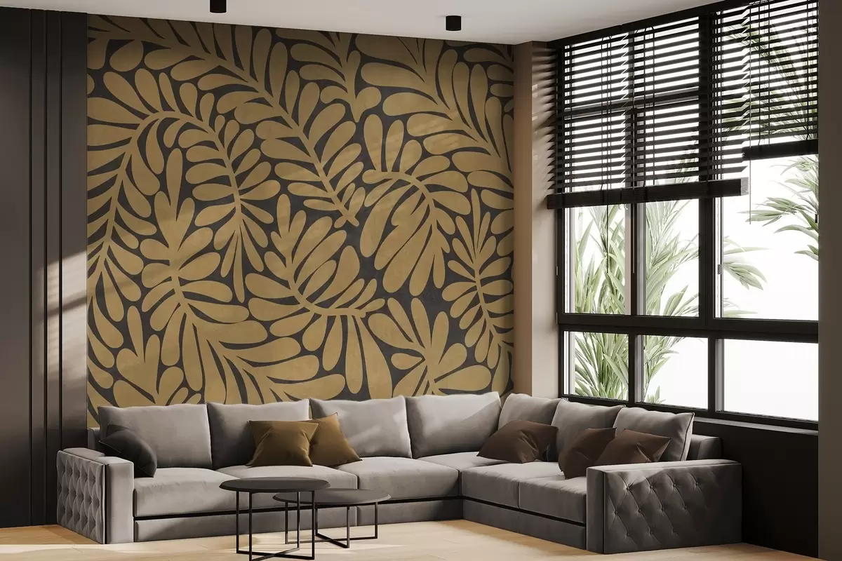 Fotobehang Gestileerde mosterdgele bladeren tegen een donkergrijze achtergrond, kunst met textuur N° w09775