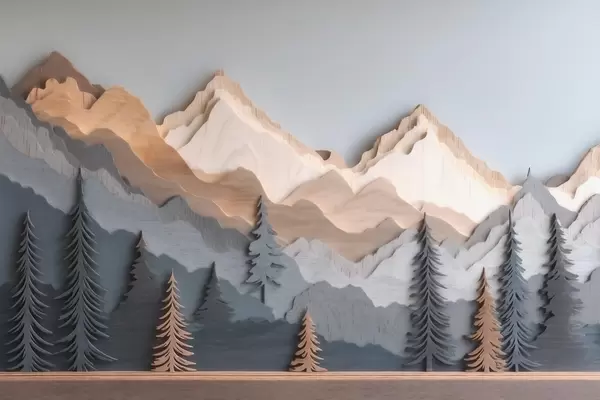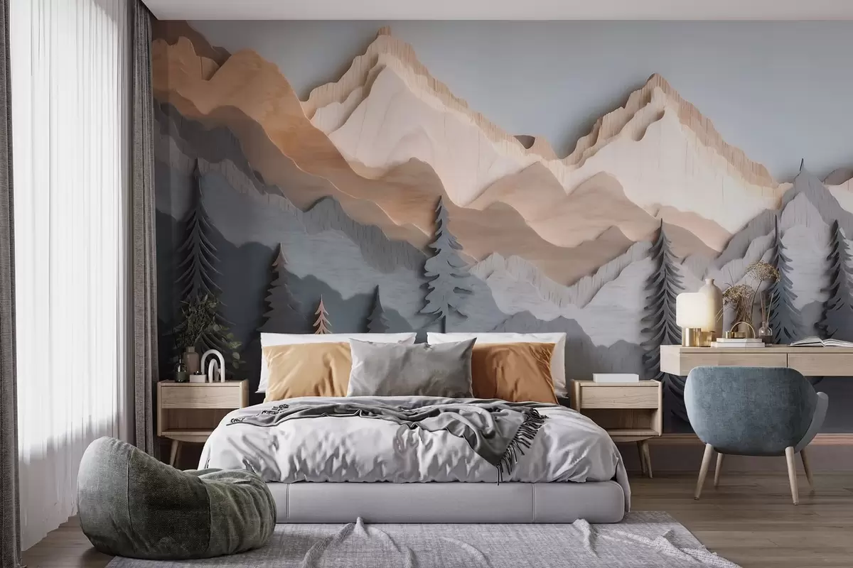 Fotobehang Natuurlandschap met dennenbomen en bergen in houtsnijwerkstijl N° w09793