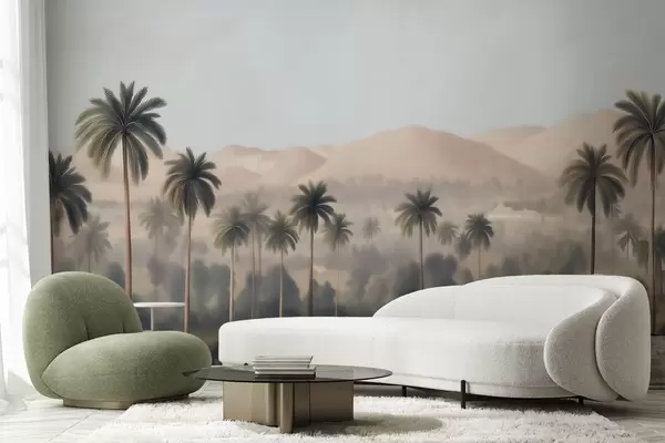 Fotobehang Tropisch landschap met palmbomen en bergen, vintage panorama in beige en groene tinten N° w09798