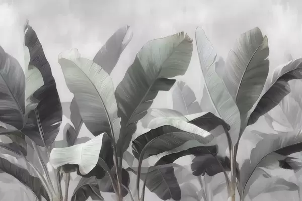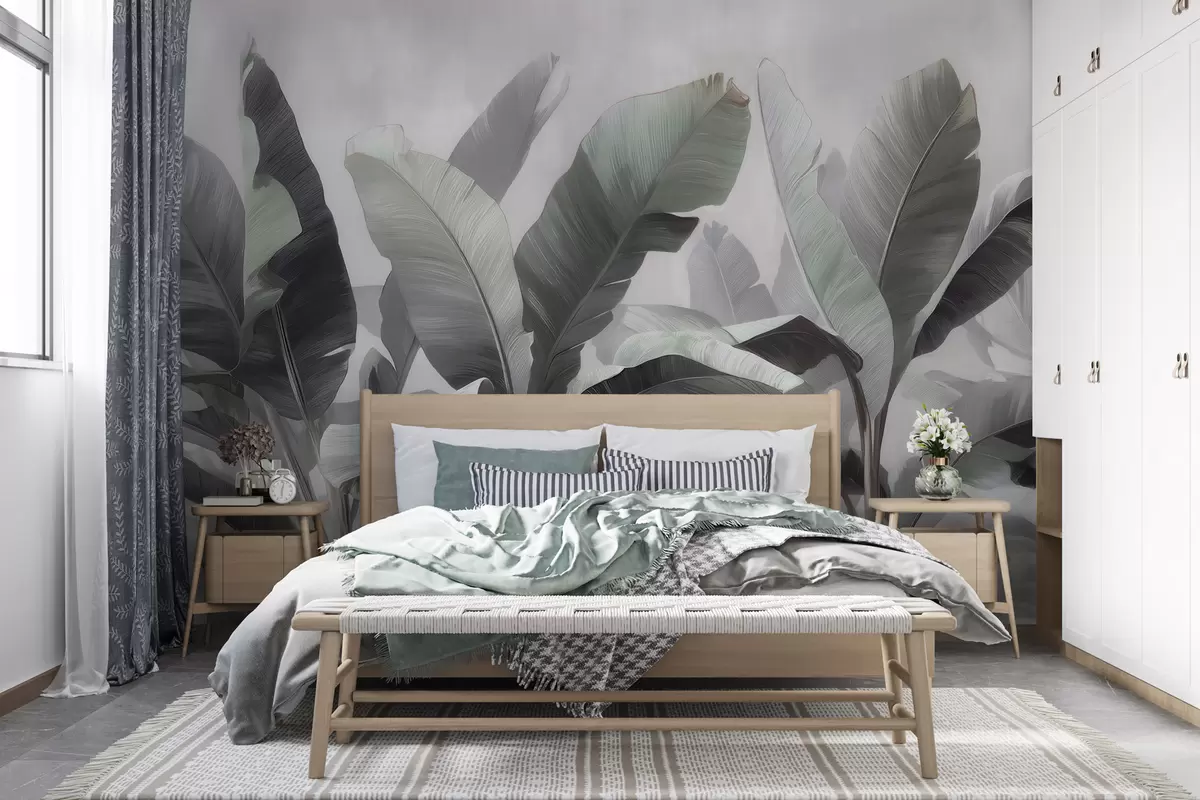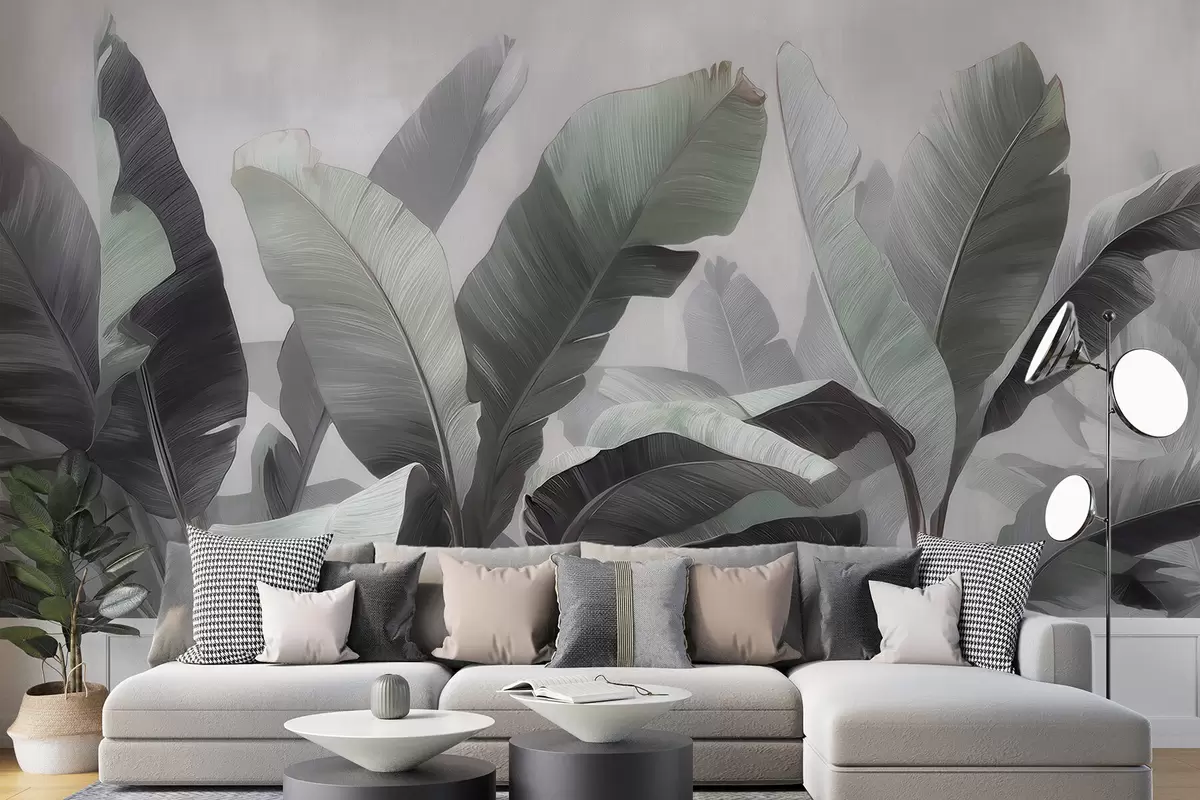 Fotobehang Abstracte afbeelding van grote tropische bananenbladeren in een neutraal kleurenpalet met zachte grijsgroene tinten N° w09805