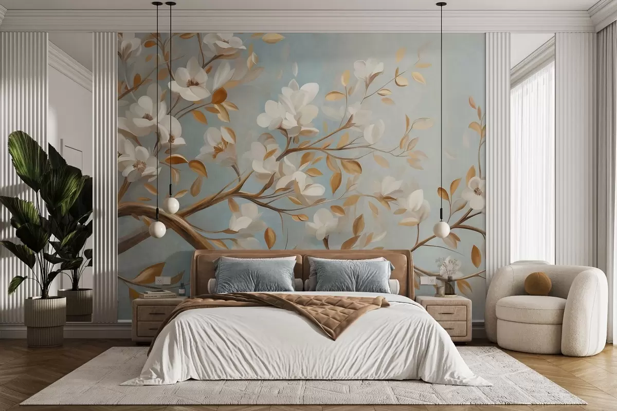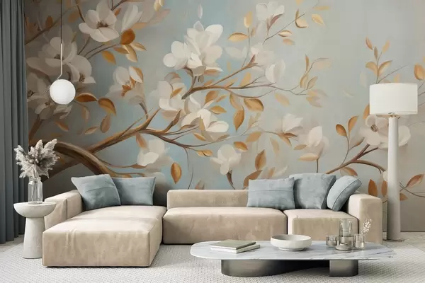 Fotobehang Een boomtak met reliëf, witte bloemen en gele bladeren, in vintage stijl N° w09814