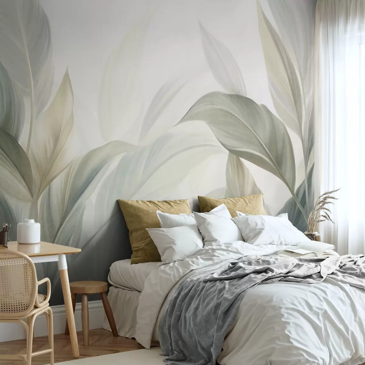 Fotobehang Grote, lichtgroene tropische bladeren met zachte pasteltinten, kunst met textuur N° w09816