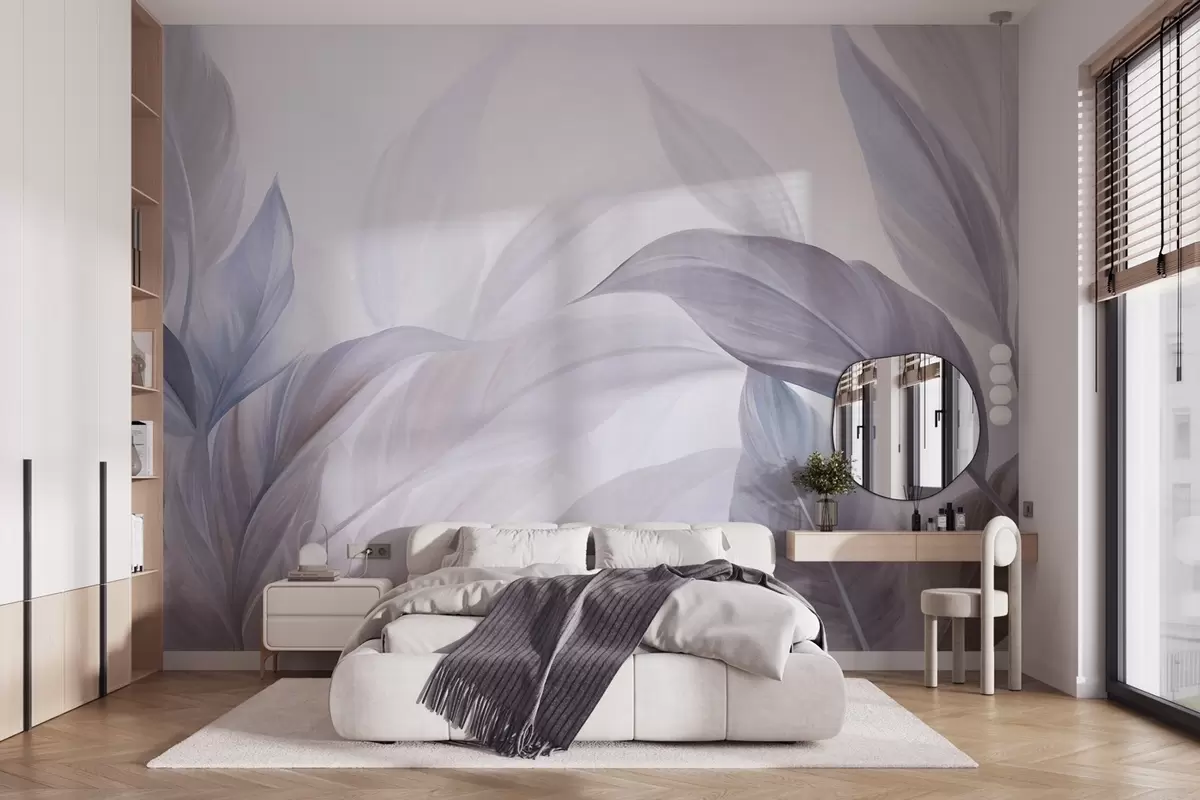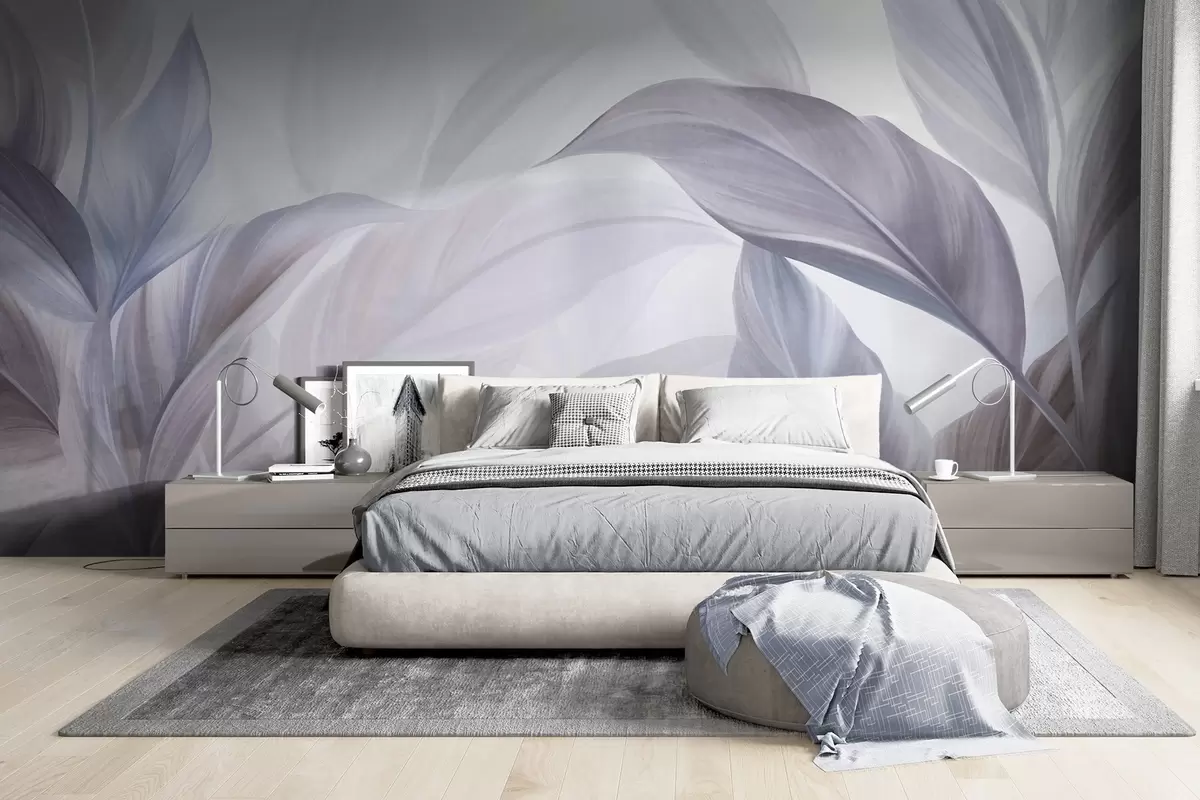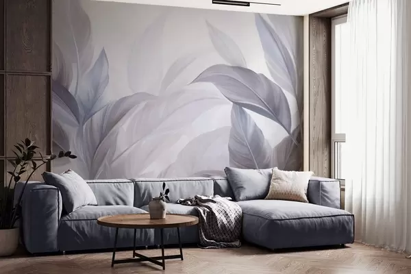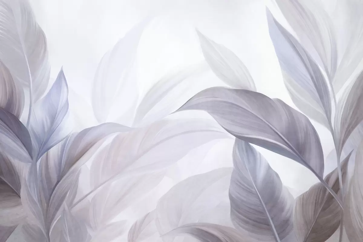 Fotobehang Grote, lichtblauwe en paarse tropische bladeren met zachte pasteltinten, kunst met textuur N° w09816v1