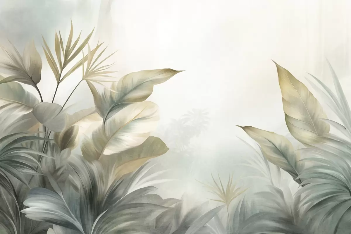 Fotobehang Grote, gestructureerde tropische bladeren in gedempte groene en beige tinten, een jungleomgeving N° w09820