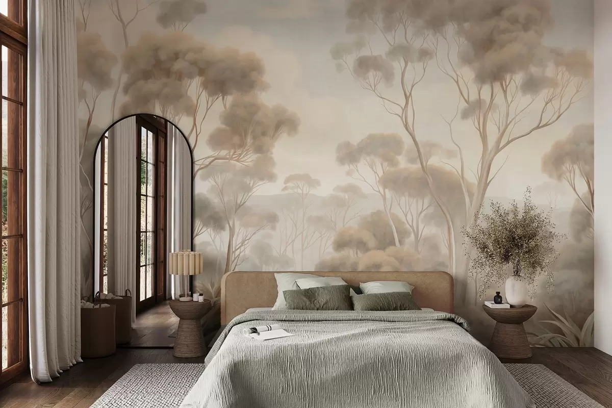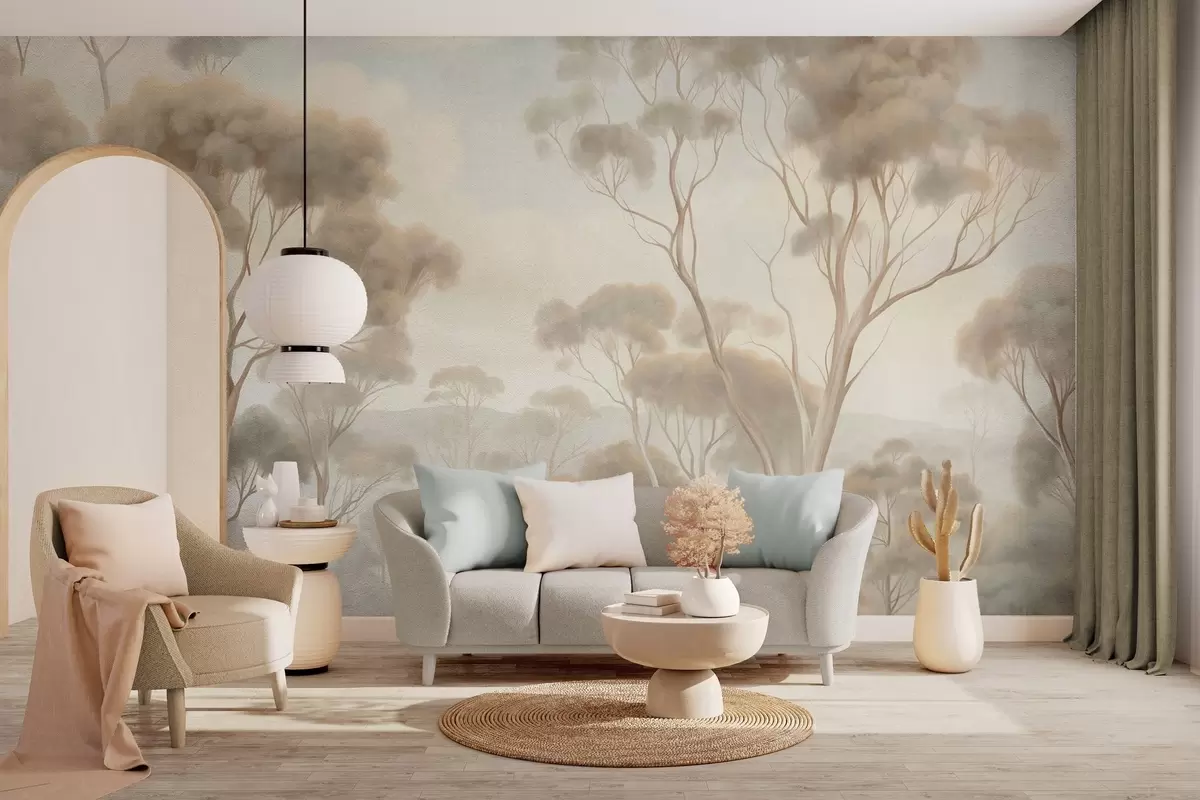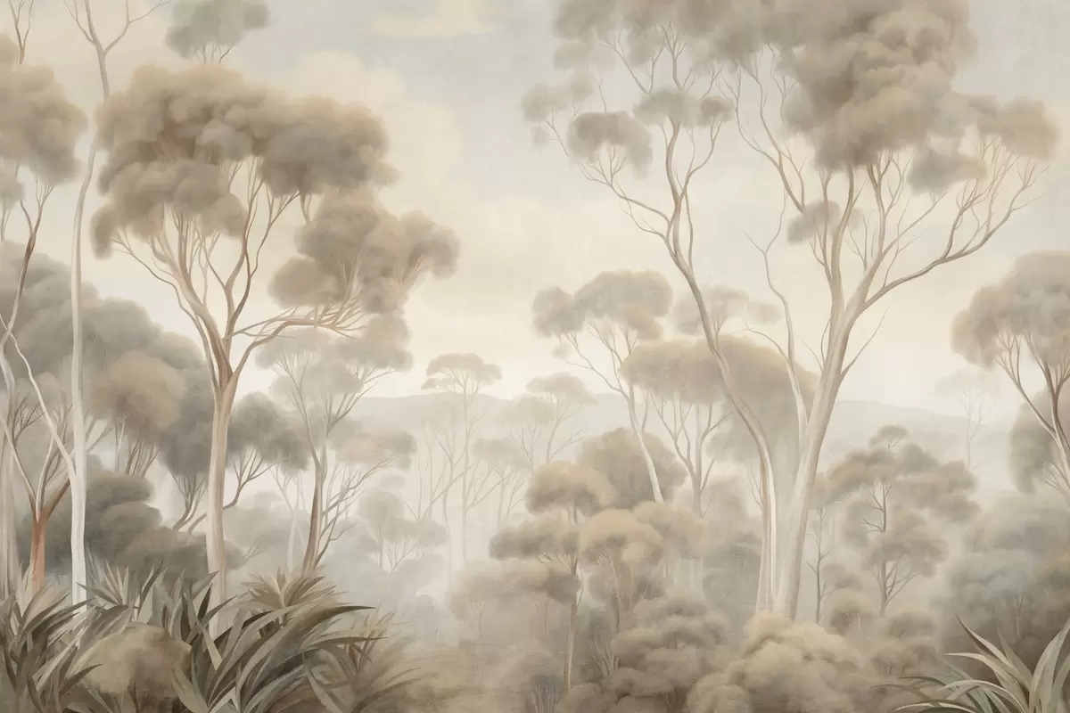 Fotobehang Een mistig boslandschap met hoge eucalyptusbomen, met glooiende heuvels onder een bewolkte hemel, een kunstwerk met textuur N° w09822