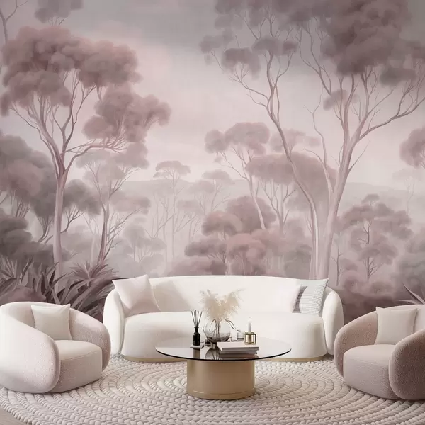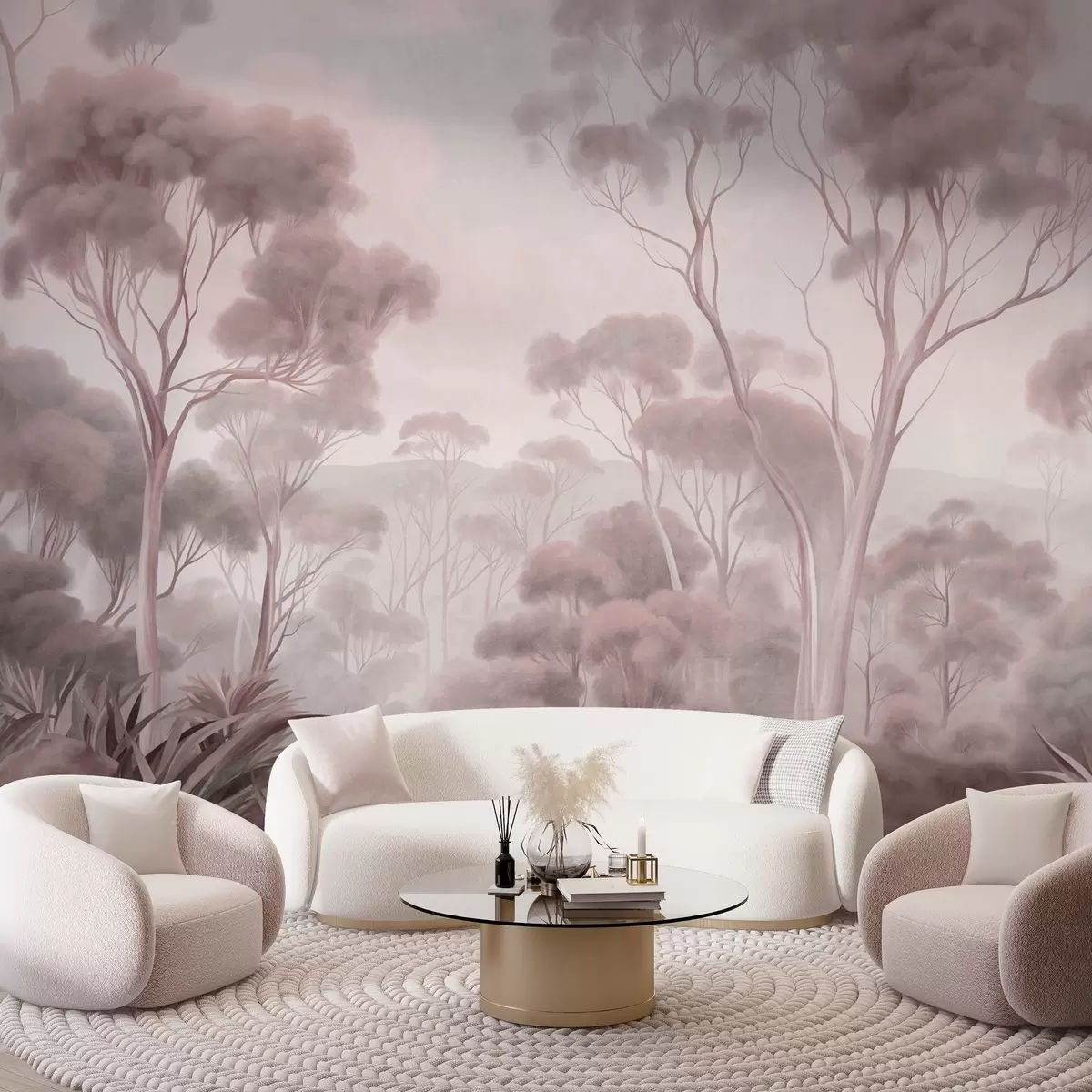 Fotobehang Een mistig boslandschap met hoge eucalyptusbomen, met glooiende heuvels onder een bewolkte hemel, een kunstwerk met textuur N° w09822v1
