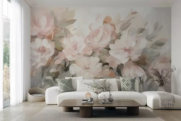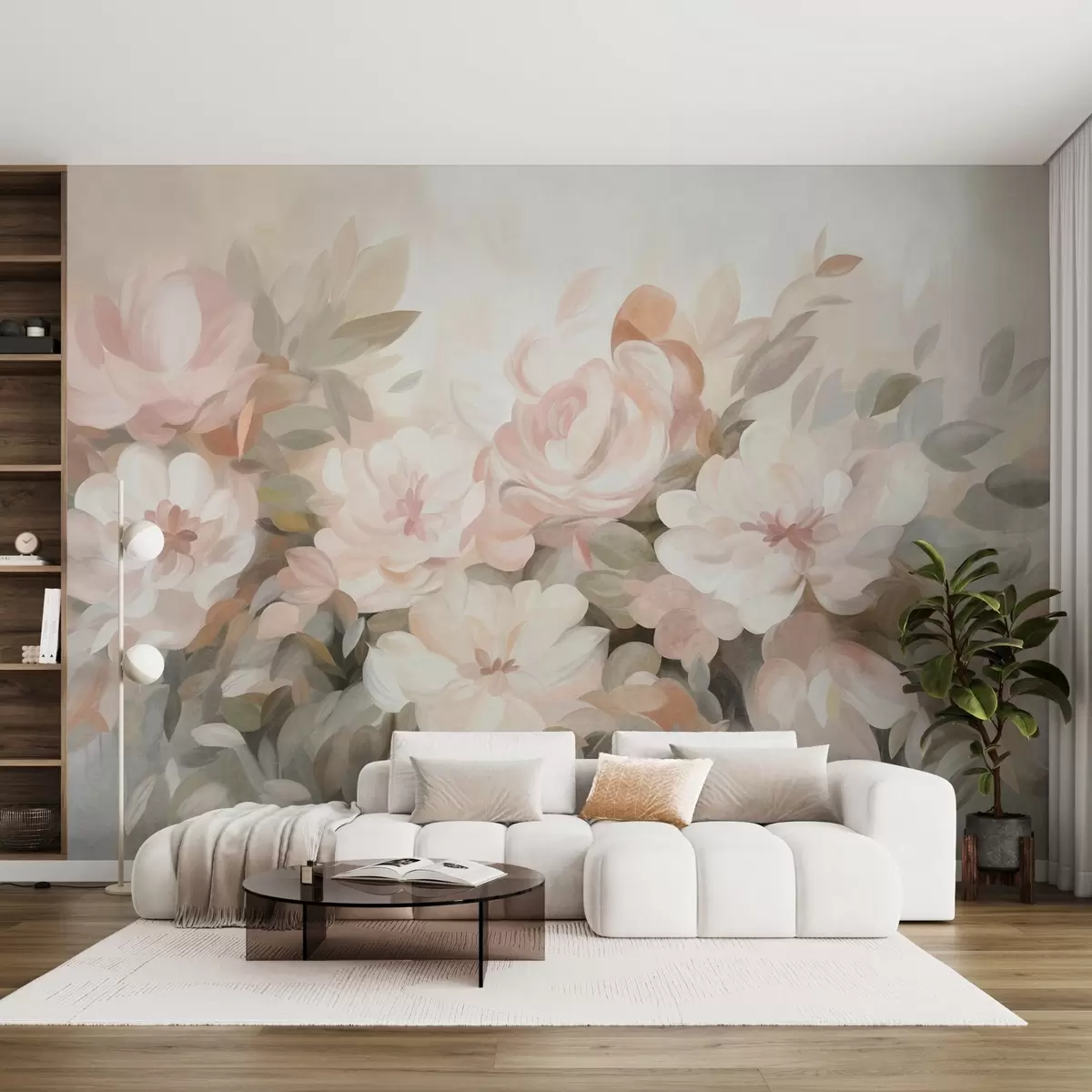 Fotobehang Lichtroze en witte bloemen met groene bladeren, geschilderde stijl, impressionistische stijl, kunst met textuur N° w09824