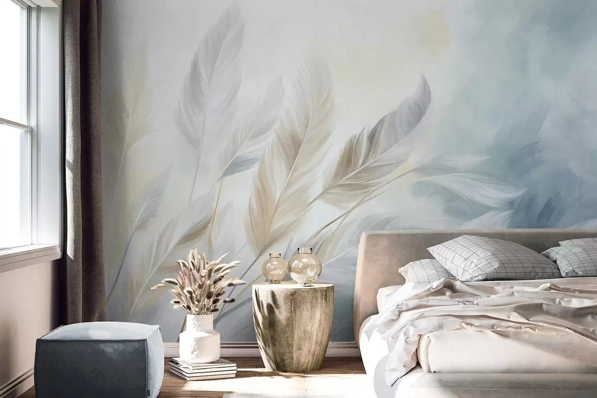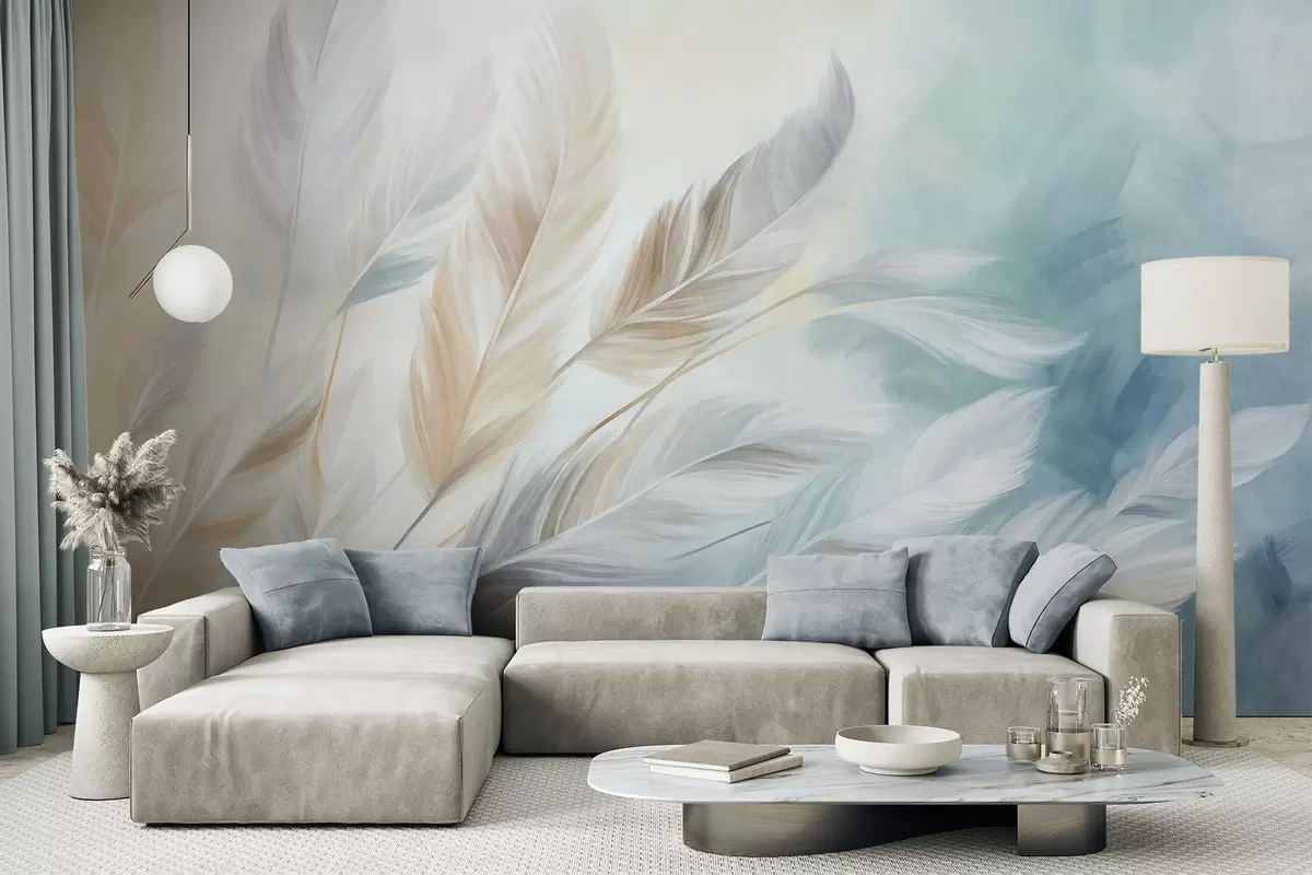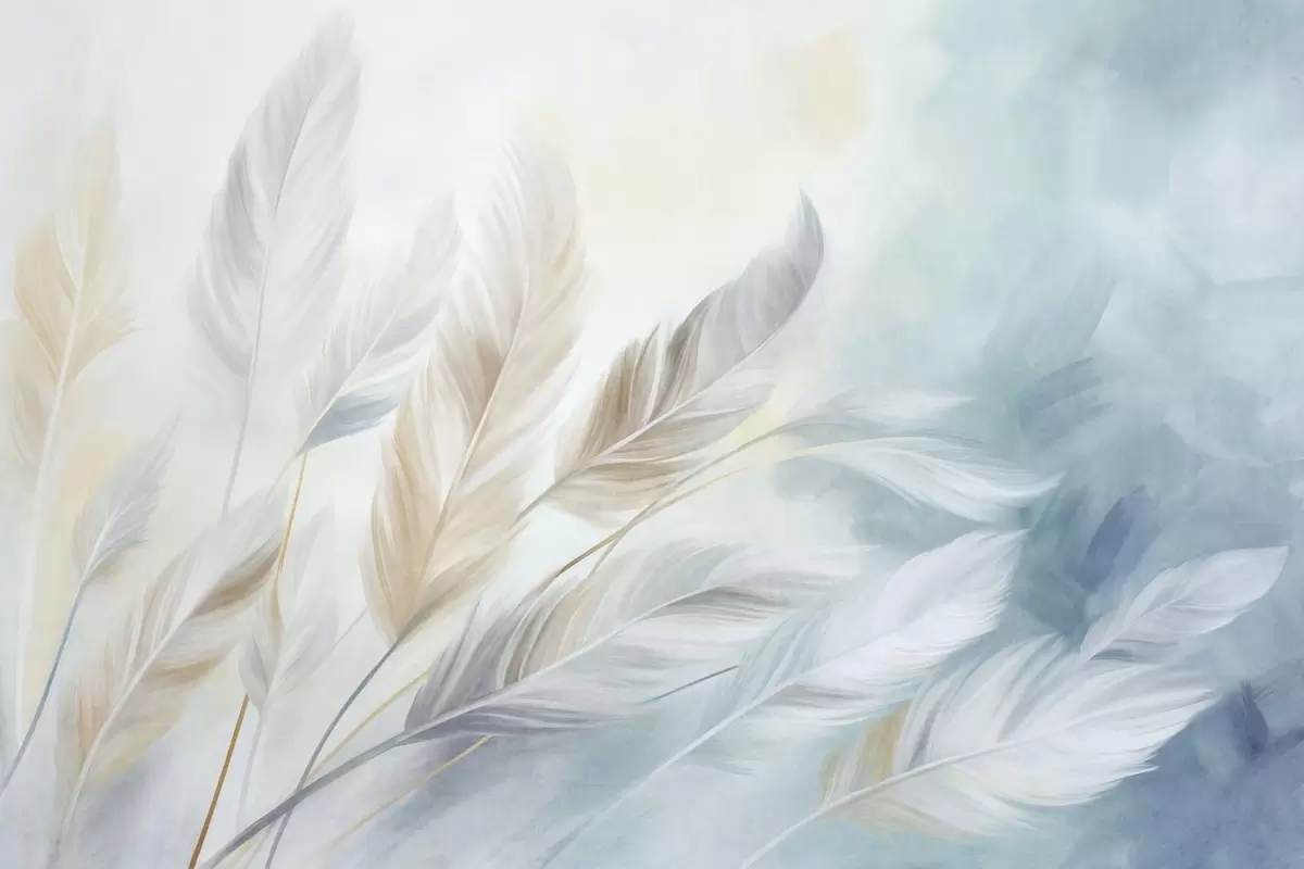 Fotobehang Pastelkleurige veren met een gestructureerd oppervlak en zachte, luchtige randen, tegen een achtergrond in aquarelstijl N° w09833