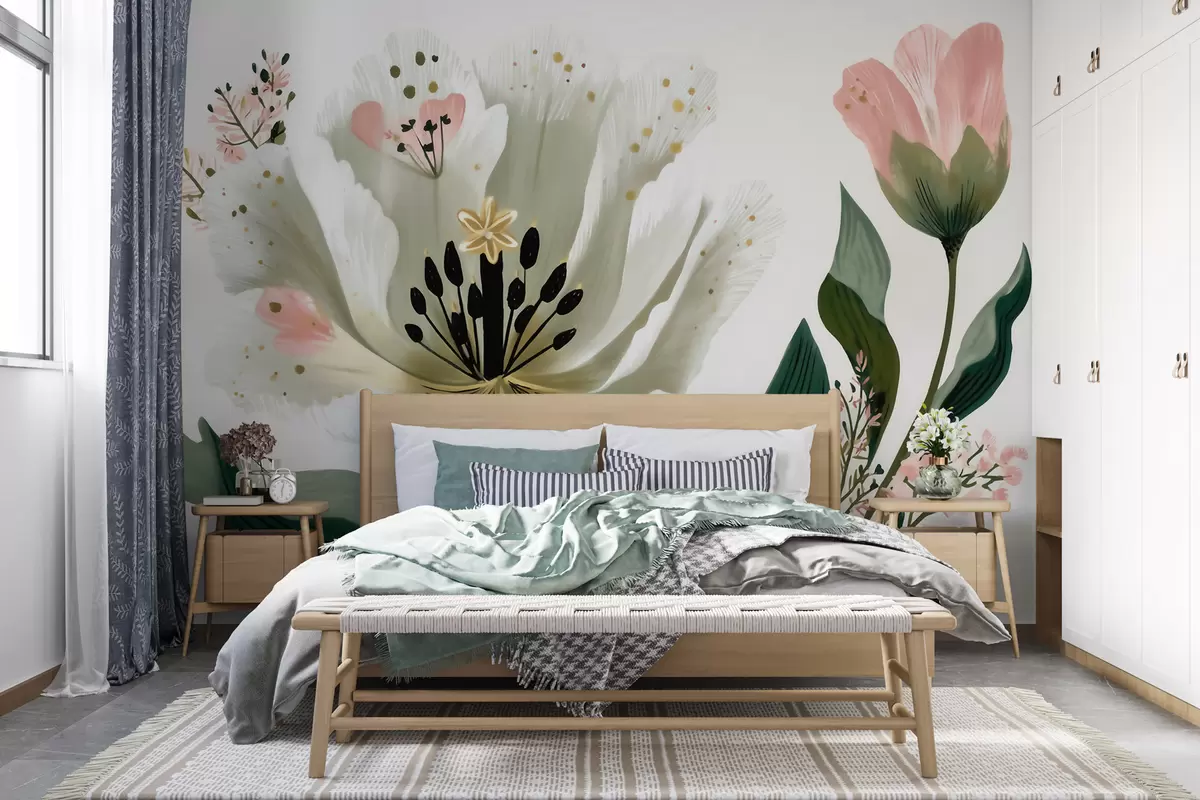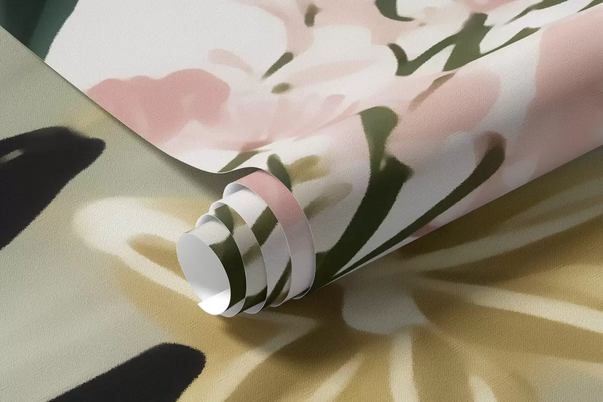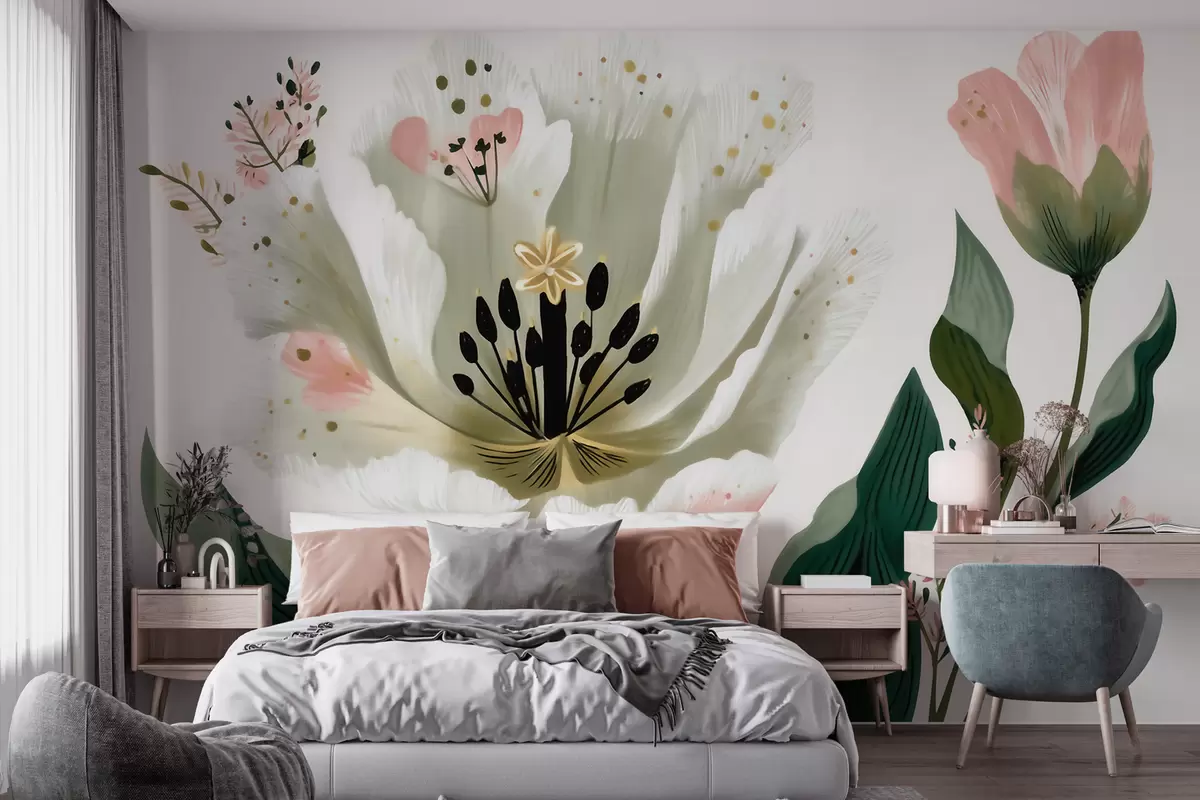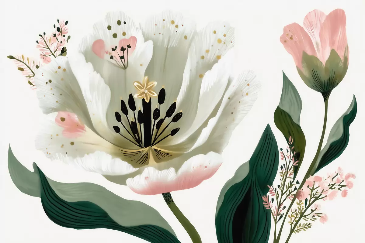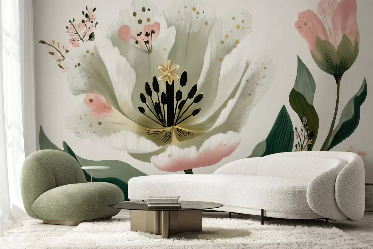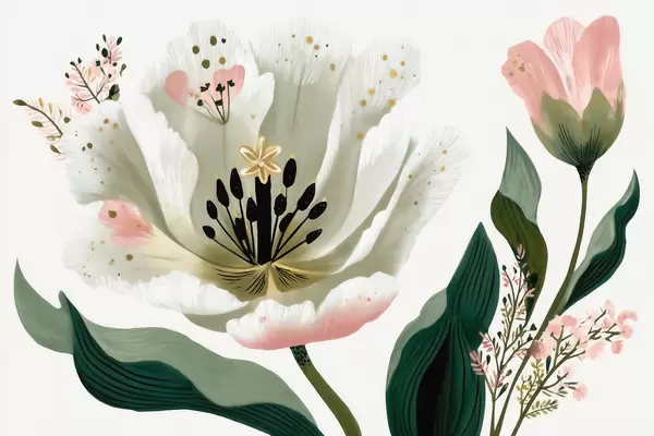Fotobehang Een bloem met groene bladeren en zachtroze accenten in aquarelstijl N° w09836