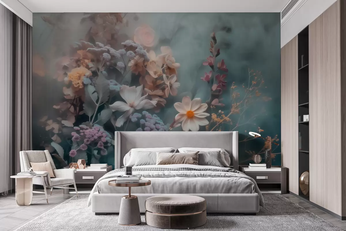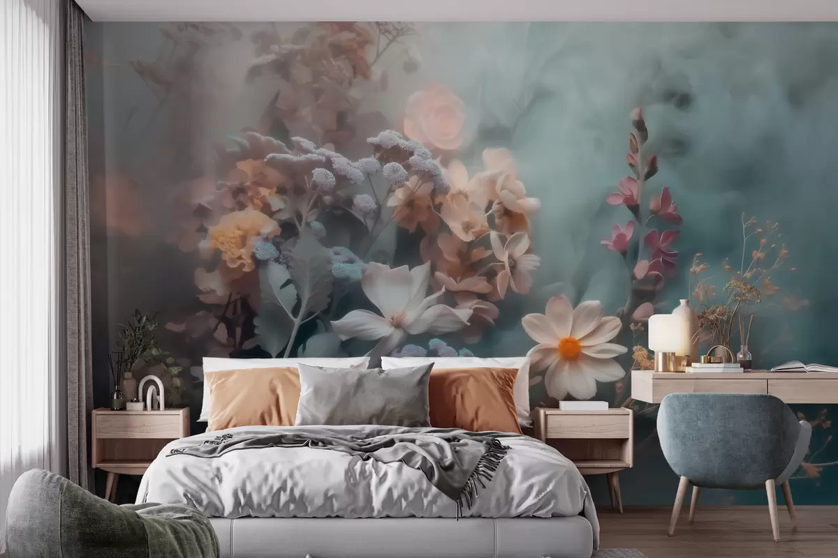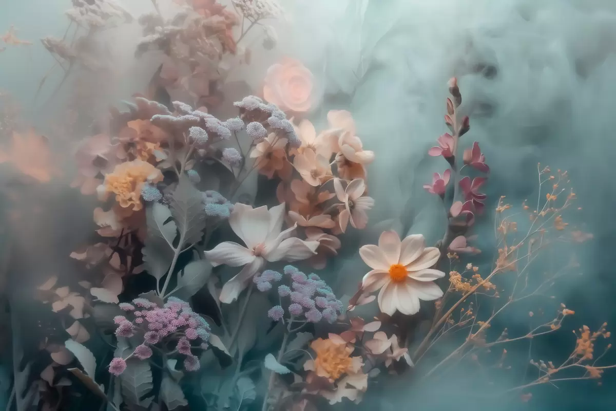 Fotobehang Een dromerig boeket van wilde bloemen in een lichte waas van pasteltinten N° w09846