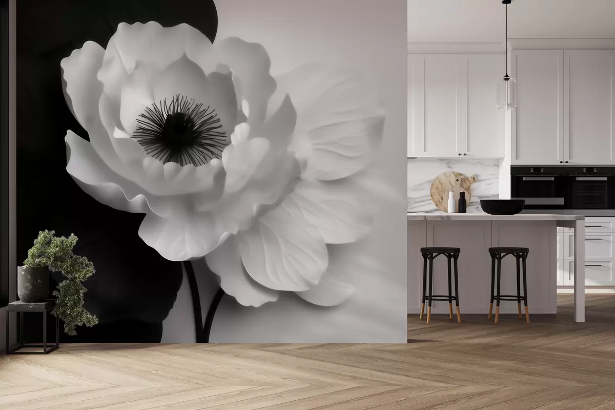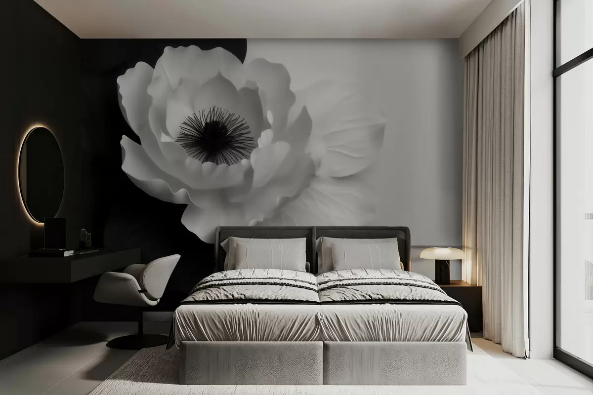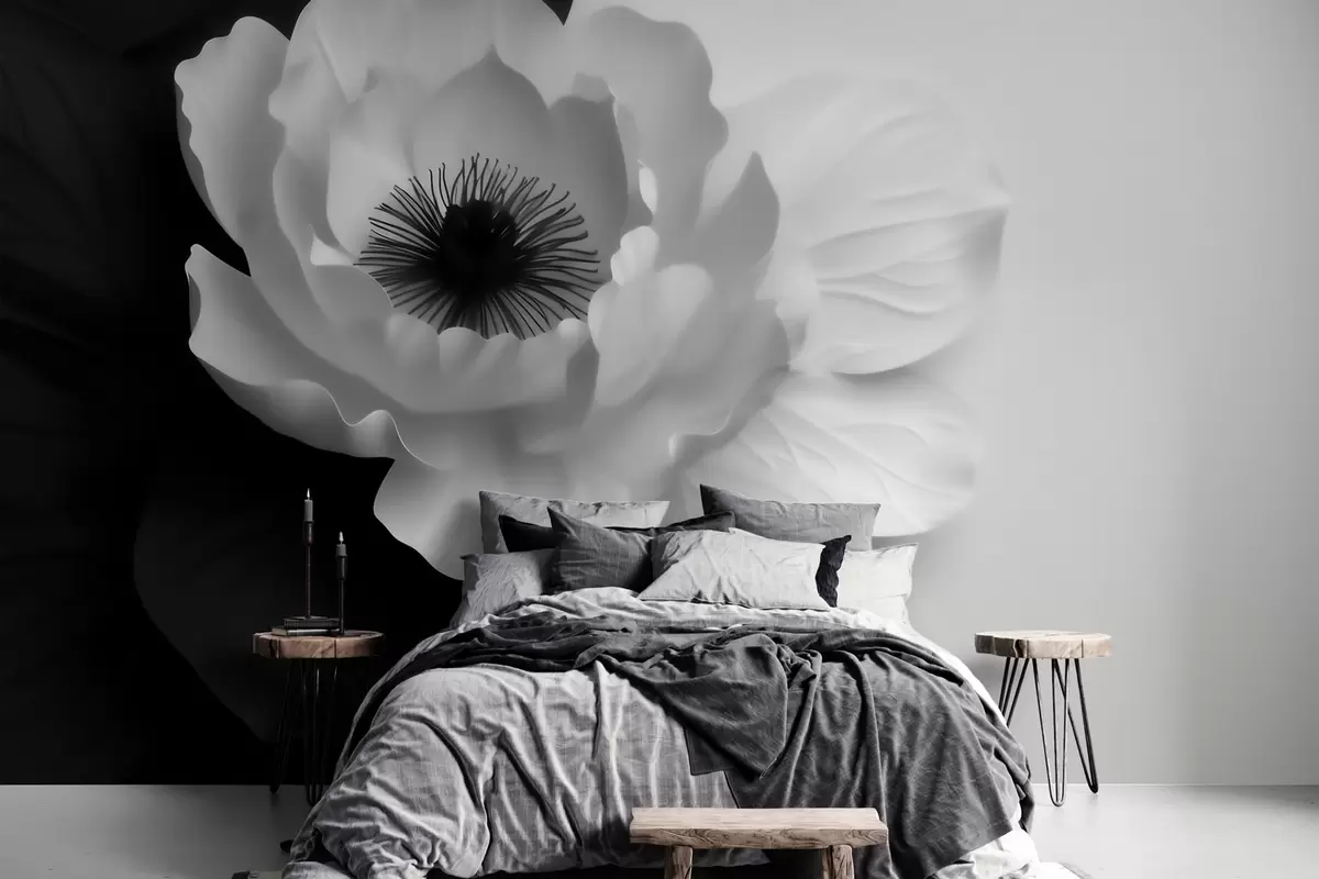 Fotobehang Een contrasterende witte bloem met een donker hart op een zwart-witte achtergrond N° w09852