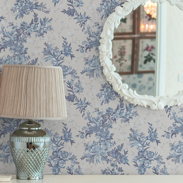 Behang Verticale bloemenstrepen in lila-blauwe tinten