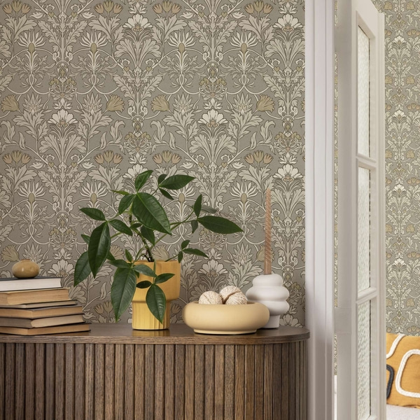 Behang Botanisch damast op mint-olijfgroene achtergrond