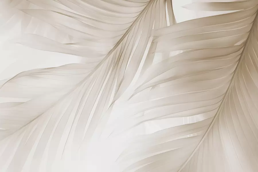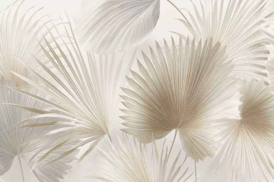 Muurschildering Zachte tropische bladwaaiers in lichtbeige en blauwachtige tinten