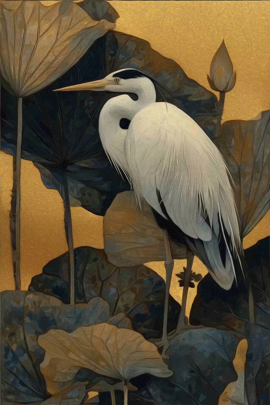 Reiger tussen lotusbloemen op een warme achtergrond