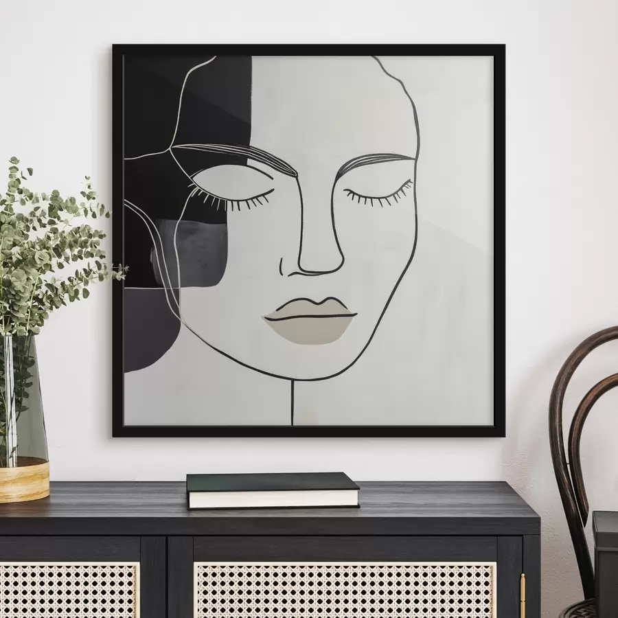 Abstracte schilderijimitatie met blauwe, grijze en witte kleuren, verticale lijnen en geometrische vormen