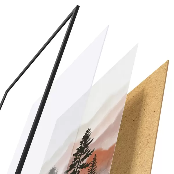 De poster bestaat uit een frame, plexiglas, geprinte afbeelding en spaanplaat achterkant. De poster kan meteen aan de muur worden gehangen dankzij de bevestigingen op de achterkant.