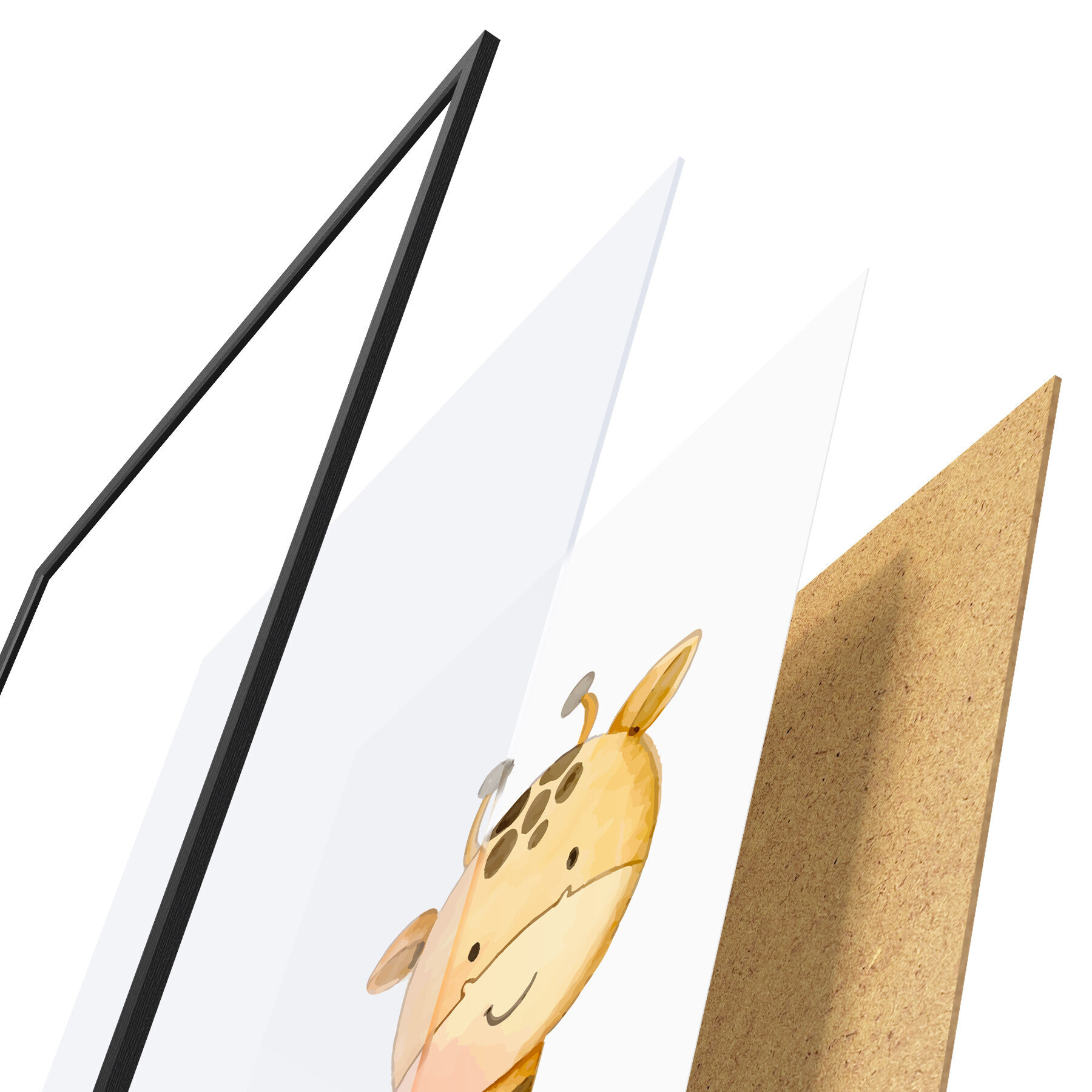 De poster bestaat uit een frame, plexiglas, geprinte afbeelding en spaanplaat achterkant. De poster kan meteen aan de muur worden gehangen dankzij de bevestigingen op de achterkant.