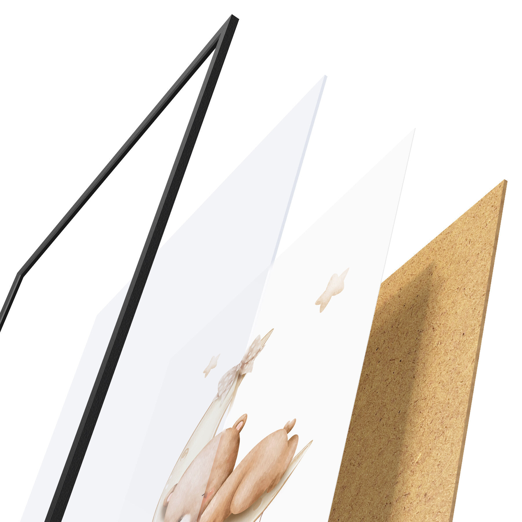 De poster bestaat uit een frame, plexiglas, geprinte afbeelding en spaanplaat achterkant. De poster kan meteen aan de muur worden gehangen dankzij de bevestigingen op de achterkant.