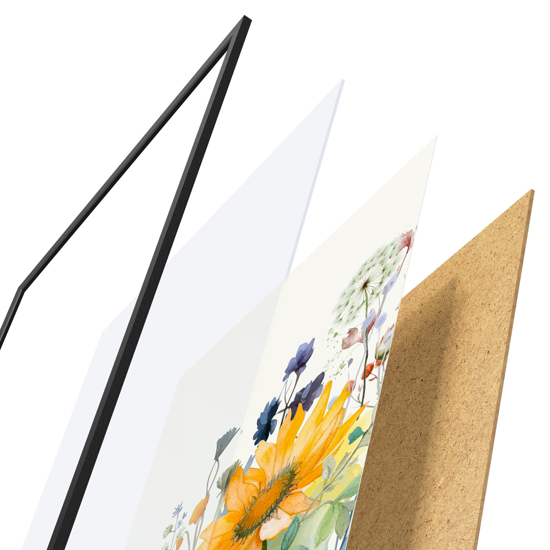 De poster bestaat uit een frame, plexiglas, geprinte afbeelding en spaanplaat achterkant. De poster kan meteen aan de muur worden gehangen dankzij de bevestigingen op de achterkant.