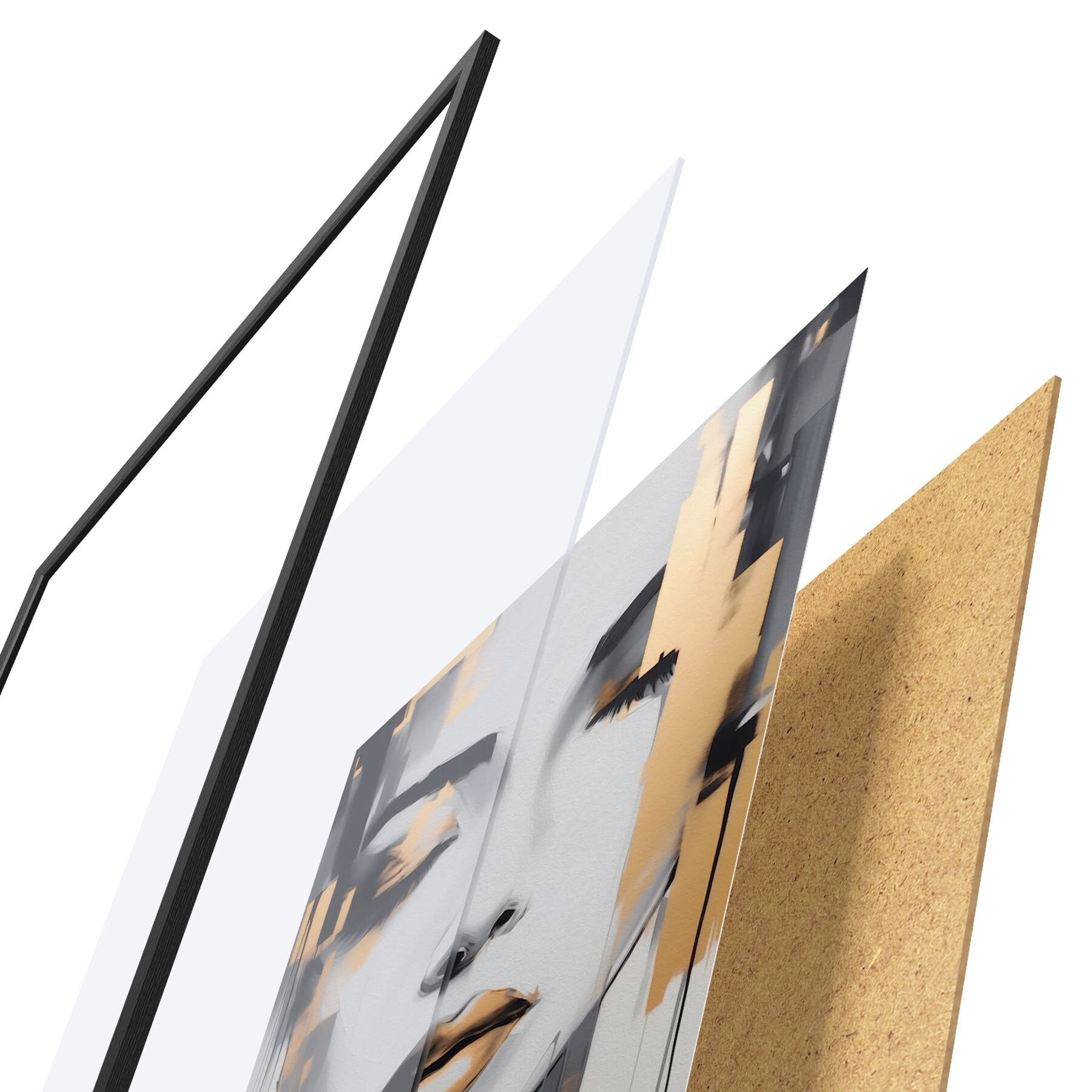 De poster bestaat uit een frame, plexiglas, geprinte afbeelding en spaanplaat achterkant. De poster kan meteen aan de muur worden gehangen dankzij de bevestigingen op de achterkant.