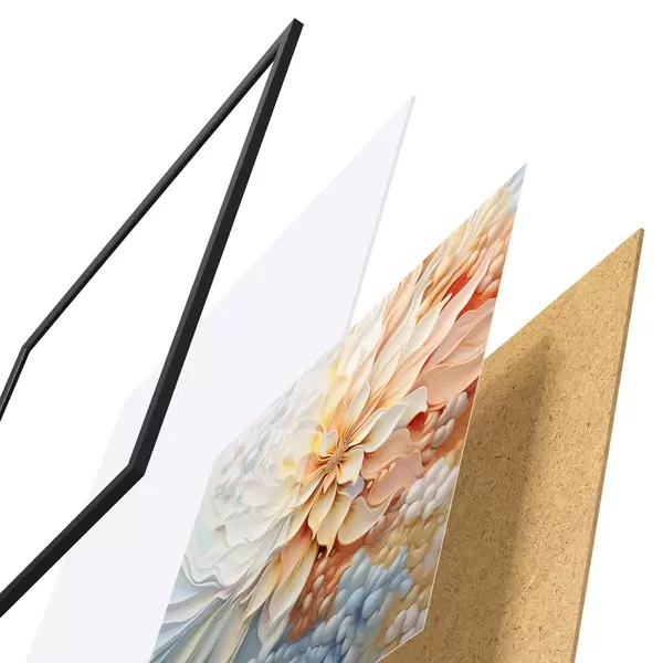 De poster bestaat uit een frame, plexiglas, geprinte afbeelding en spaanplaat achterkant. De poster kan meteen aan de muur worden gehangen dankzij de bevestigingen op de achterkant.