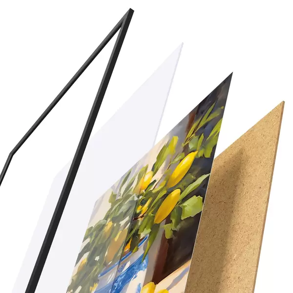 De poster bestaat uit een frame, plexiglas, geprinte afbeelding en spaanplaat achterkant. De poster kan meteen aan de muur worden gehangen dankzij de bevestigingen op de achterkant.