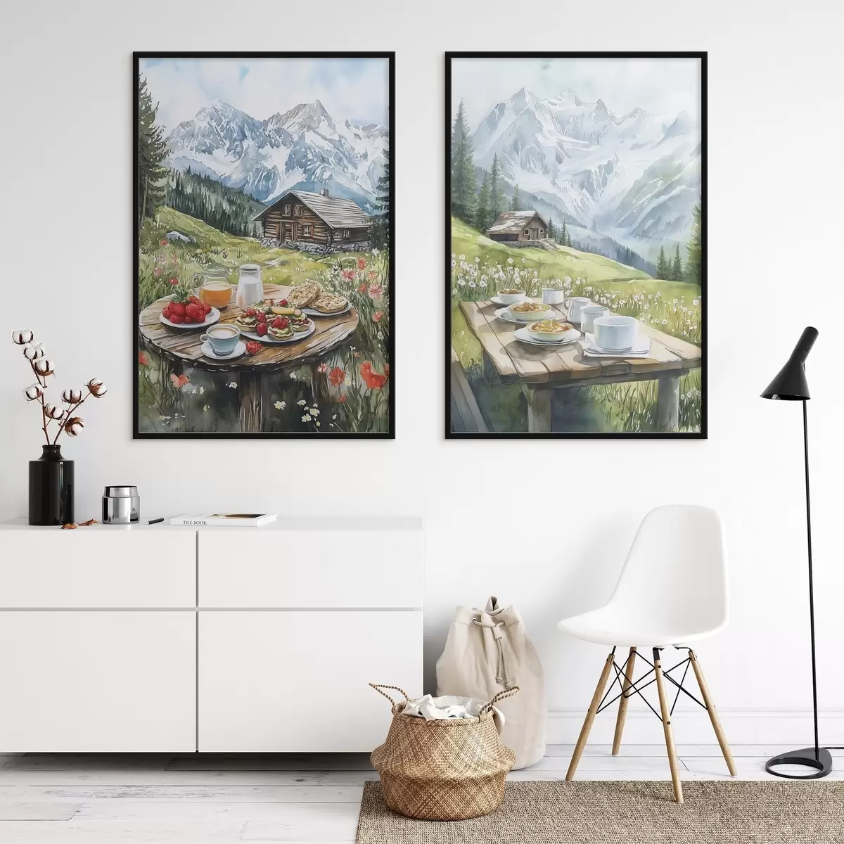Poster De Alpen, prachtig berglandschap, esthetisch ontbijt, houten huizen N° d00403