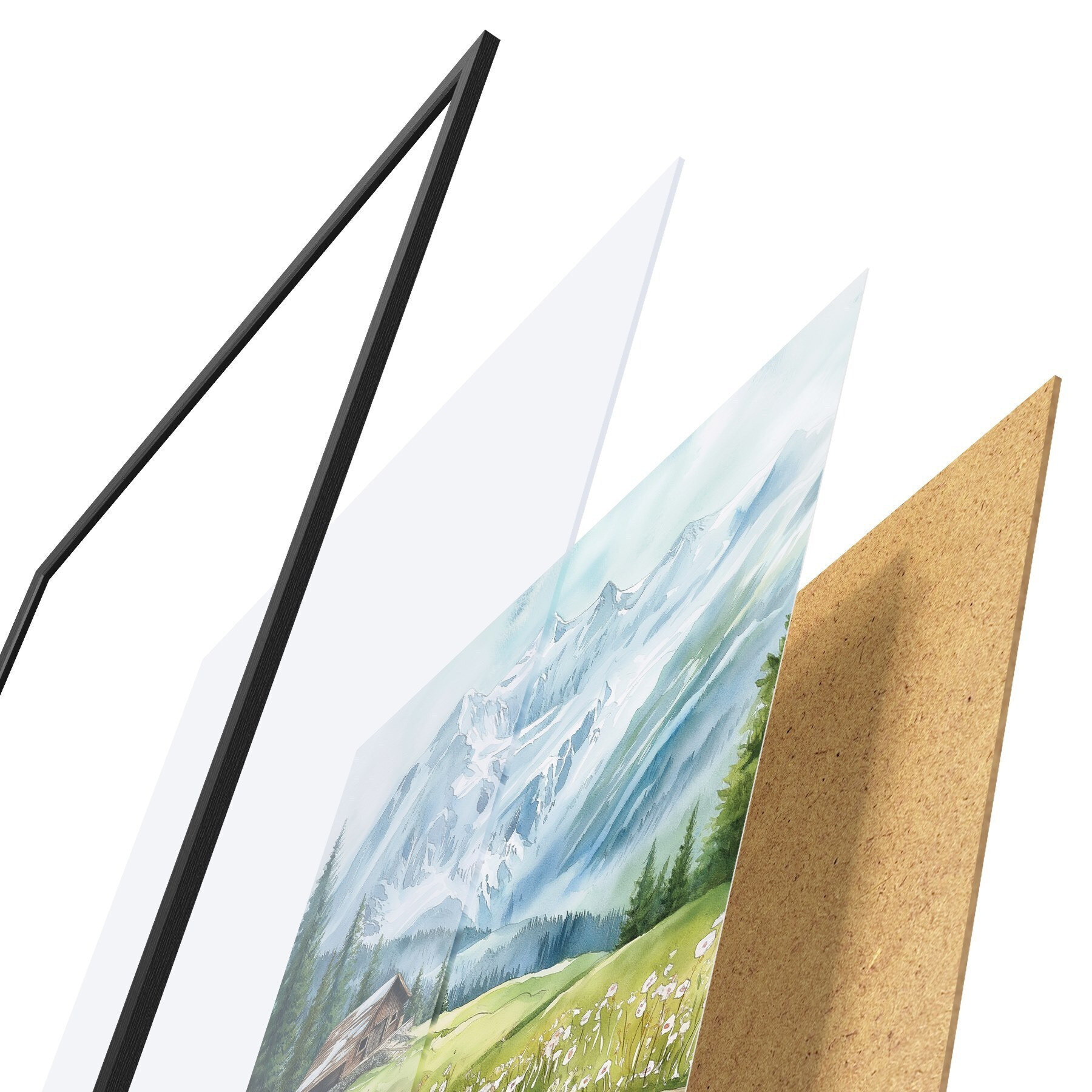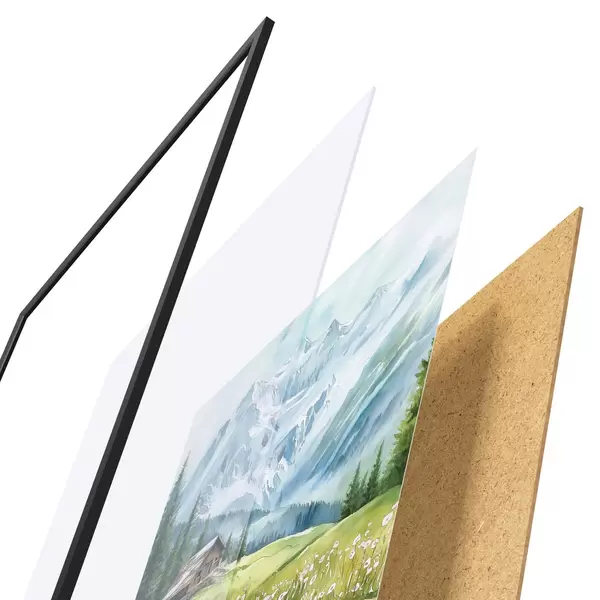 De poster bestaat uit een frame, plexiglas, geprinte afbeelding en spaanplaat achterkant. De poster kan meteen aan de muur worden gehangen dankzij de bevestigingen op de achterkant.