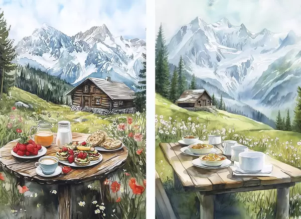 Poster De Alpen, prachtig berglandschap, esthetisch ontbijt, houten huizen N° d00403