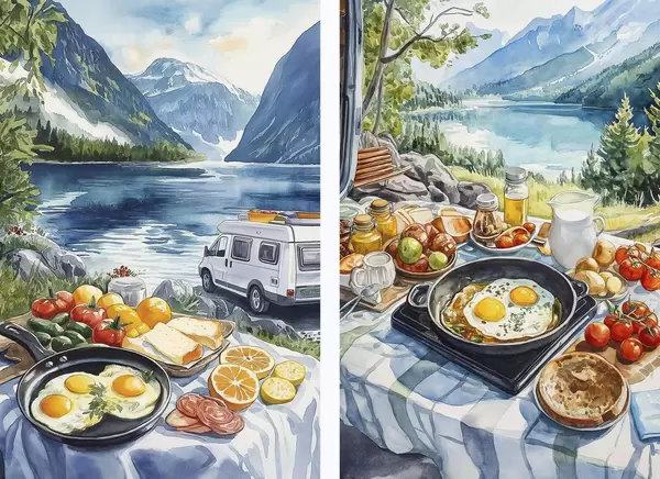Poster Ontbijt in de natuur, reizen, buitenleven, aquarelstijl, Noorwegen d00404