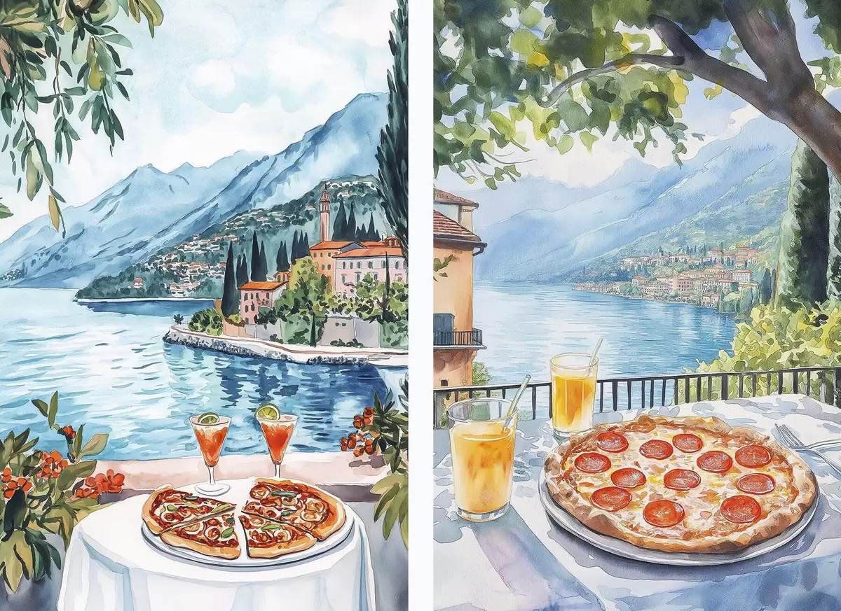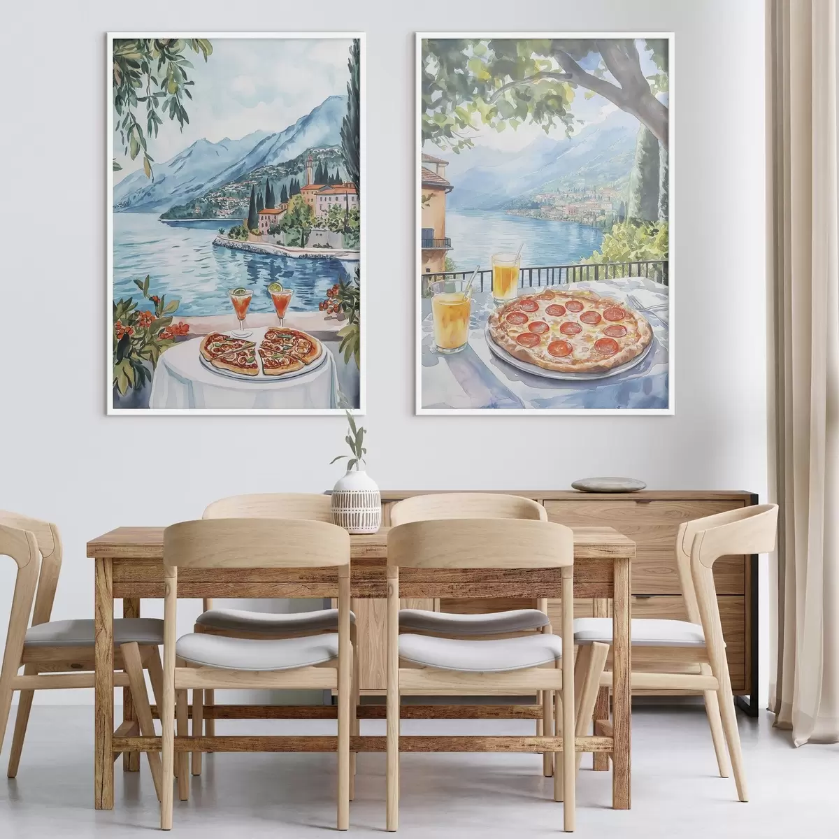 Poster Comomeer, brunch in Italië, aquarelstijl, pizza margarita, zomernatuur d00406