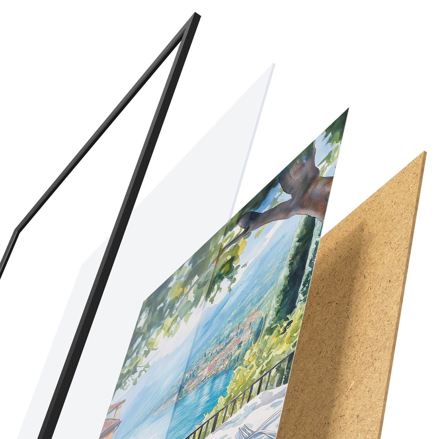 De poster bestaat uit een frame, plexiglas, geprinte afbeelding en spaanplaat achterkant. De poster kan meteen aan de muur worden gehangen dankzij de bevestigingen op de achterkant.