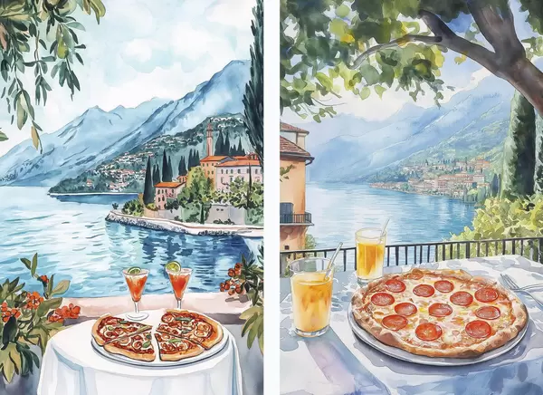 Poster Comomeer, brunch in Italië, aquarelstijl, pizza margarita, zomernatuur d00406