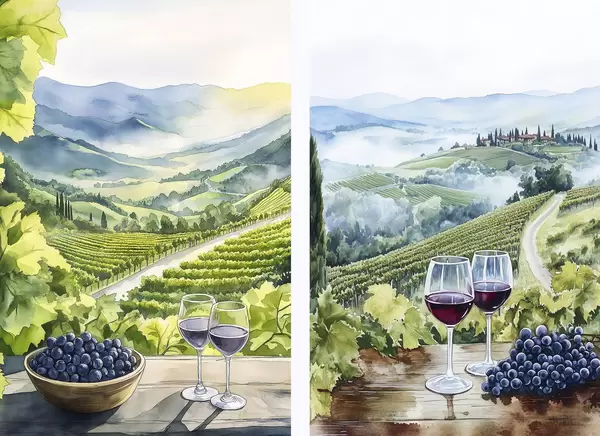Poster Mooie Toscaanse landschappen, wijngaarden, wijnglazen, aquarel stijl, Italië d00408