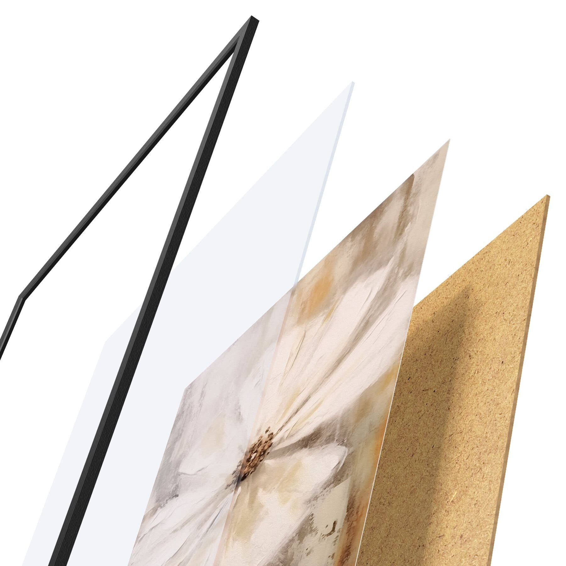 De poster bestaat uit een frame, plexiglas, geprinte afbeelding en spaanplaat achterkant. De poster kan meteen aan de muur worden gehangen dankzij de bevestigingen op de achterkant.