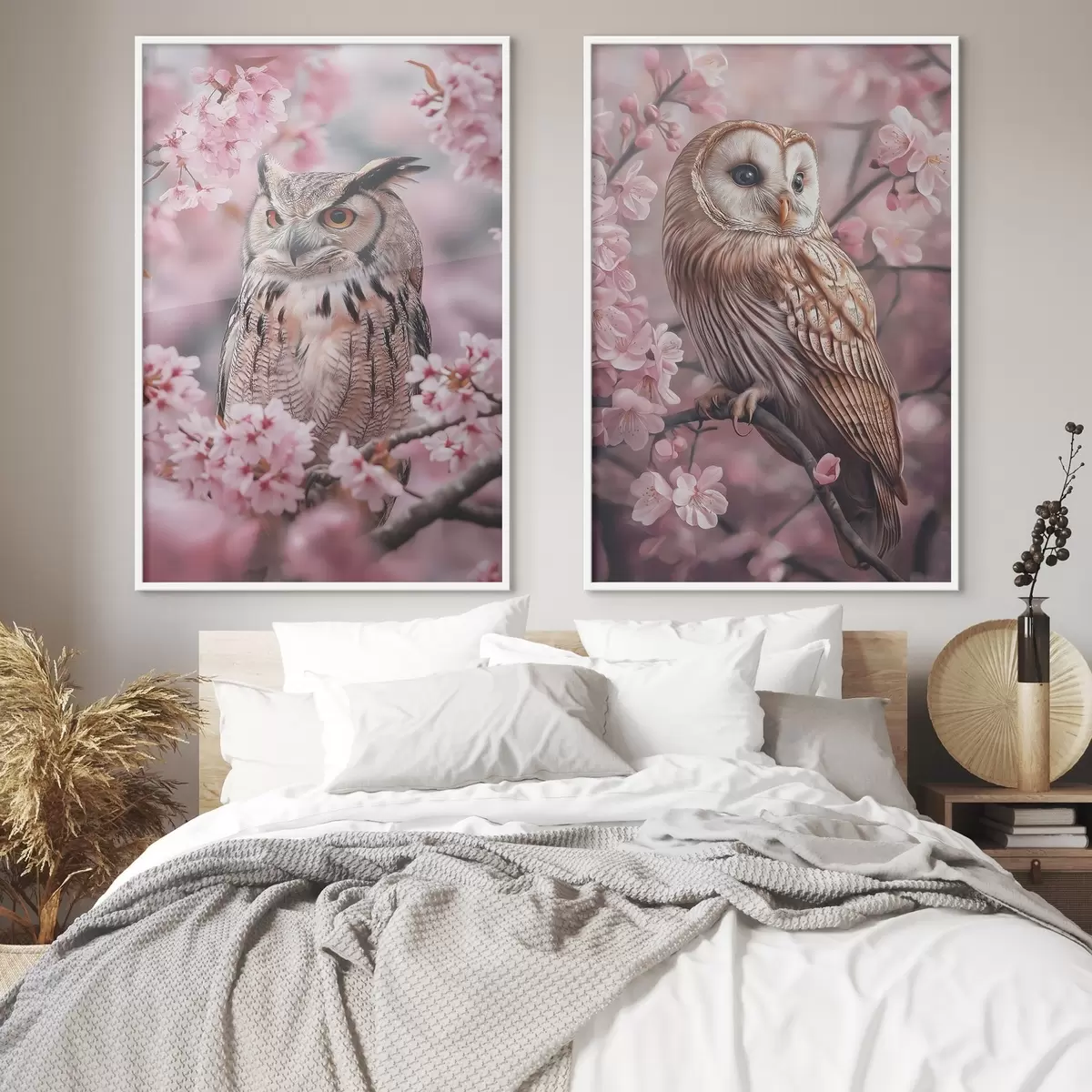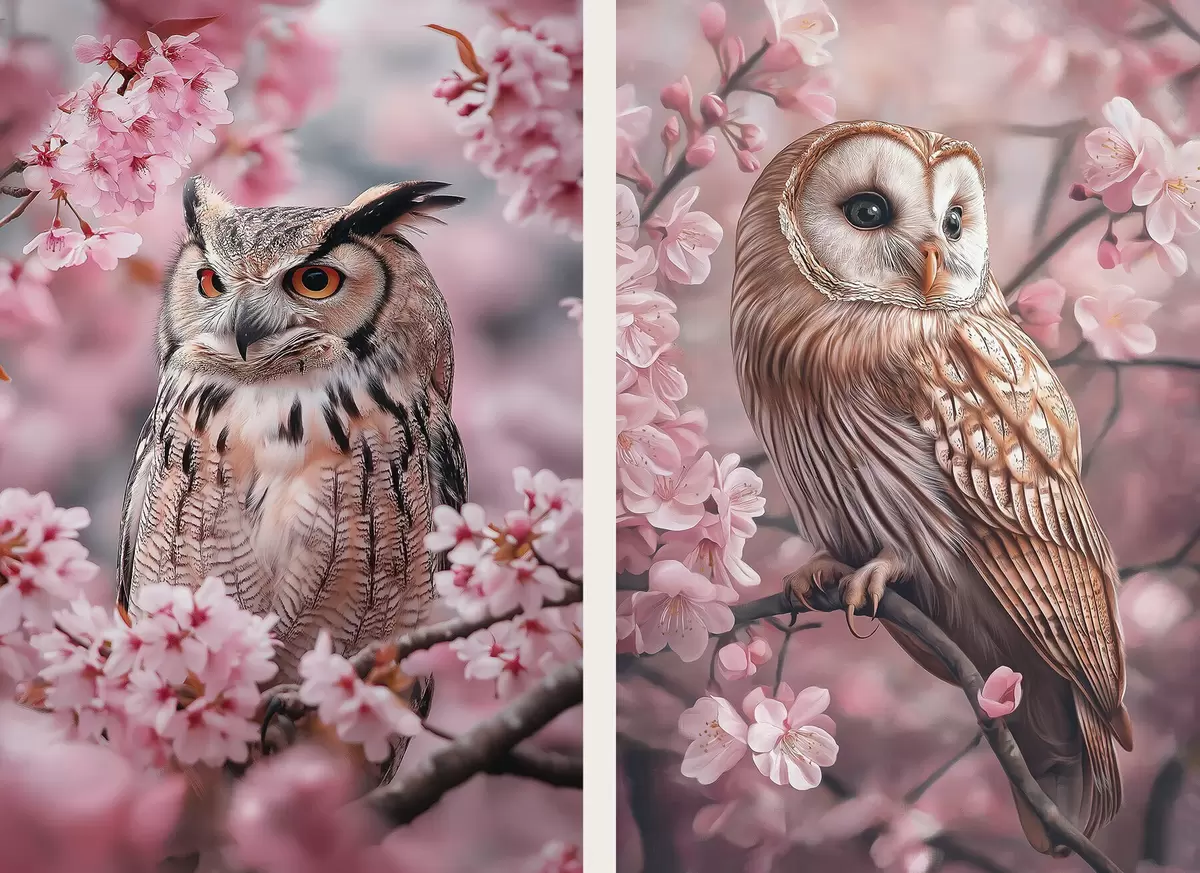 Poster Uilen op de kersenboom, roze bloemen, realisme, natuur d00411