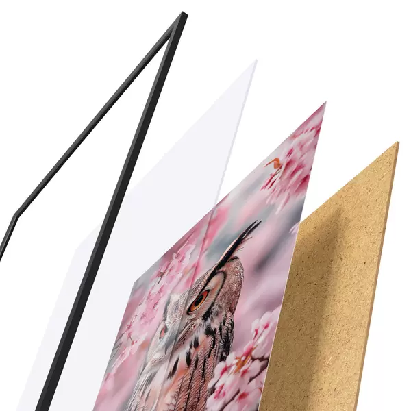 De poster bestaat uit een frame, plexiglas, geprinte afbeelding en spaanplaat achterkant. De poster kan meteen aan de muur worden gehangen dankzij de bevestigingen op de achterkant.